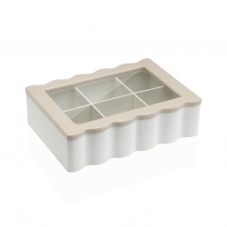 CAIXA CHÁ BRANCA 6 COMPARTIMENTOS Referencia: 21920333 Medidas: 24x16.5x7 cm. Material: Madeira paulownia Vidrio Packaging: SACO PLÁSTICO Info: 6 compartimentos de 7x7cm Certificado: FSC