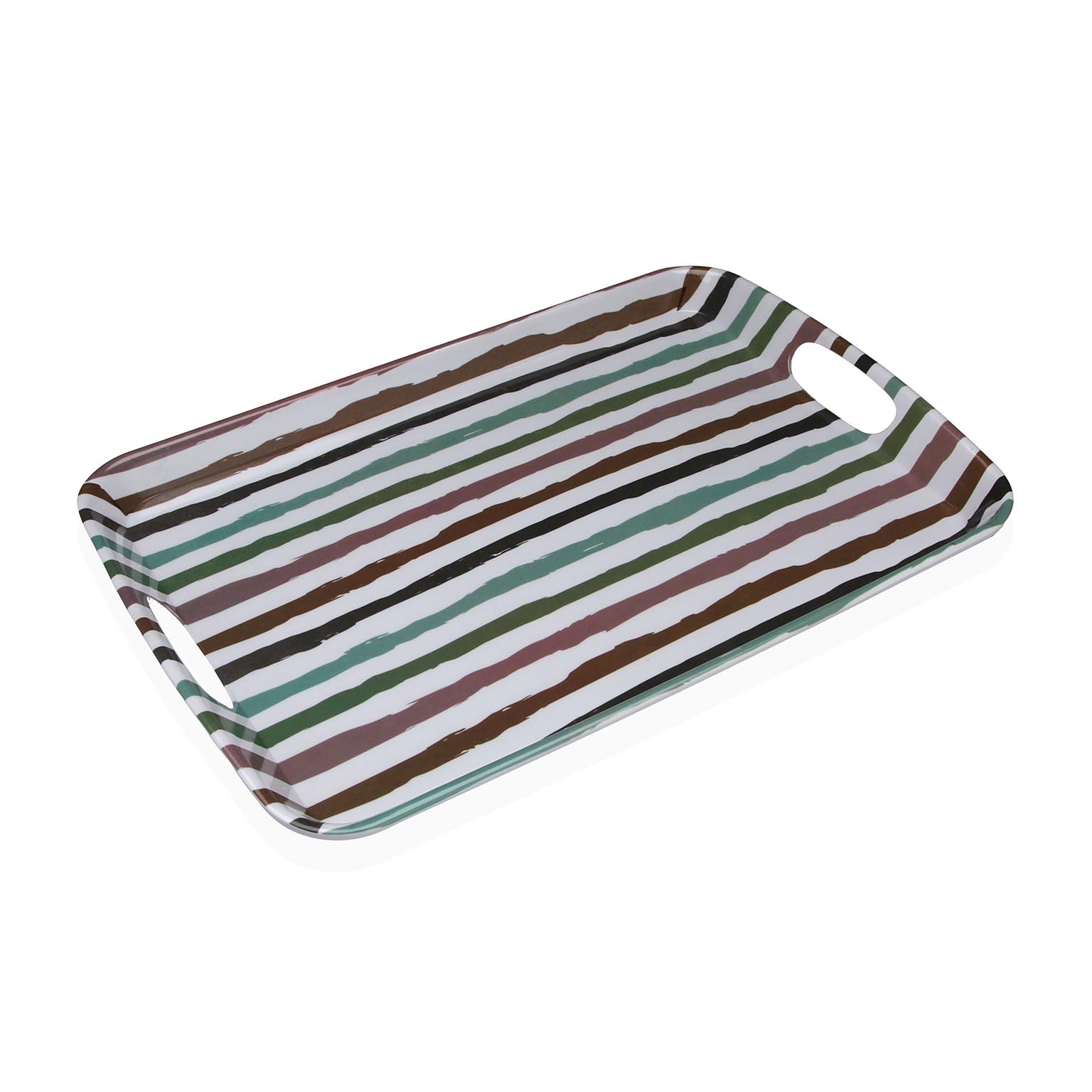 Com um elegante padrão listrado em tons de verde, marrom, cinza e branco, é ideal para servir bebidas e aperitivos ou para organizar utensílios na cozinha.