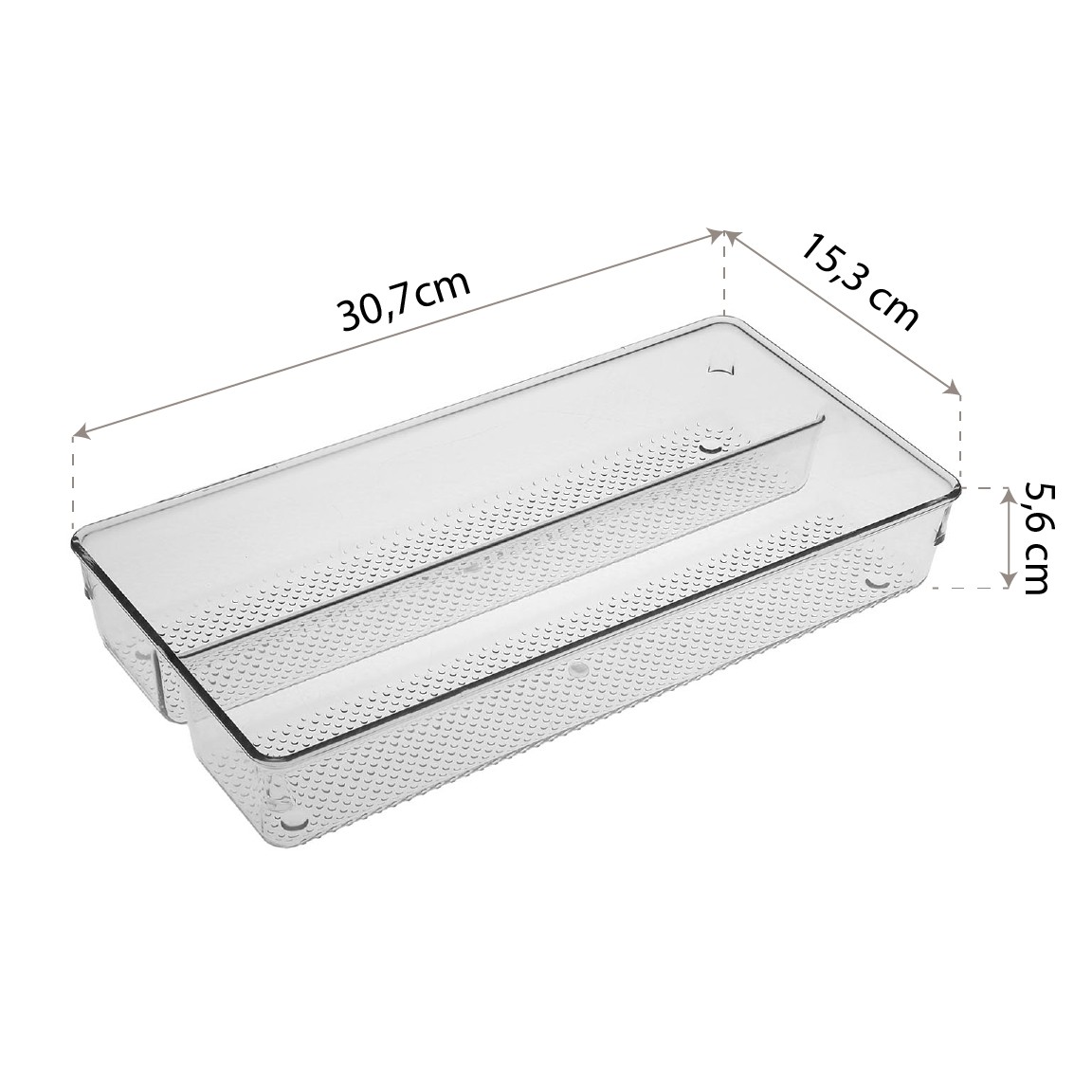 Com dimensões de 5,8 cm de altura, 30,7 cm de largura e 15,3 cm de comprimento, este recipiente em plástico transparente permite uma fácil visualização do conteúdo.