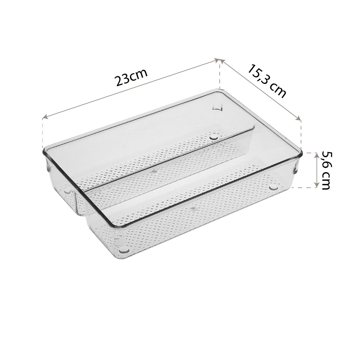 Fabricada em plástico transparente, permite visualizar facilmente o conteúdo interno.