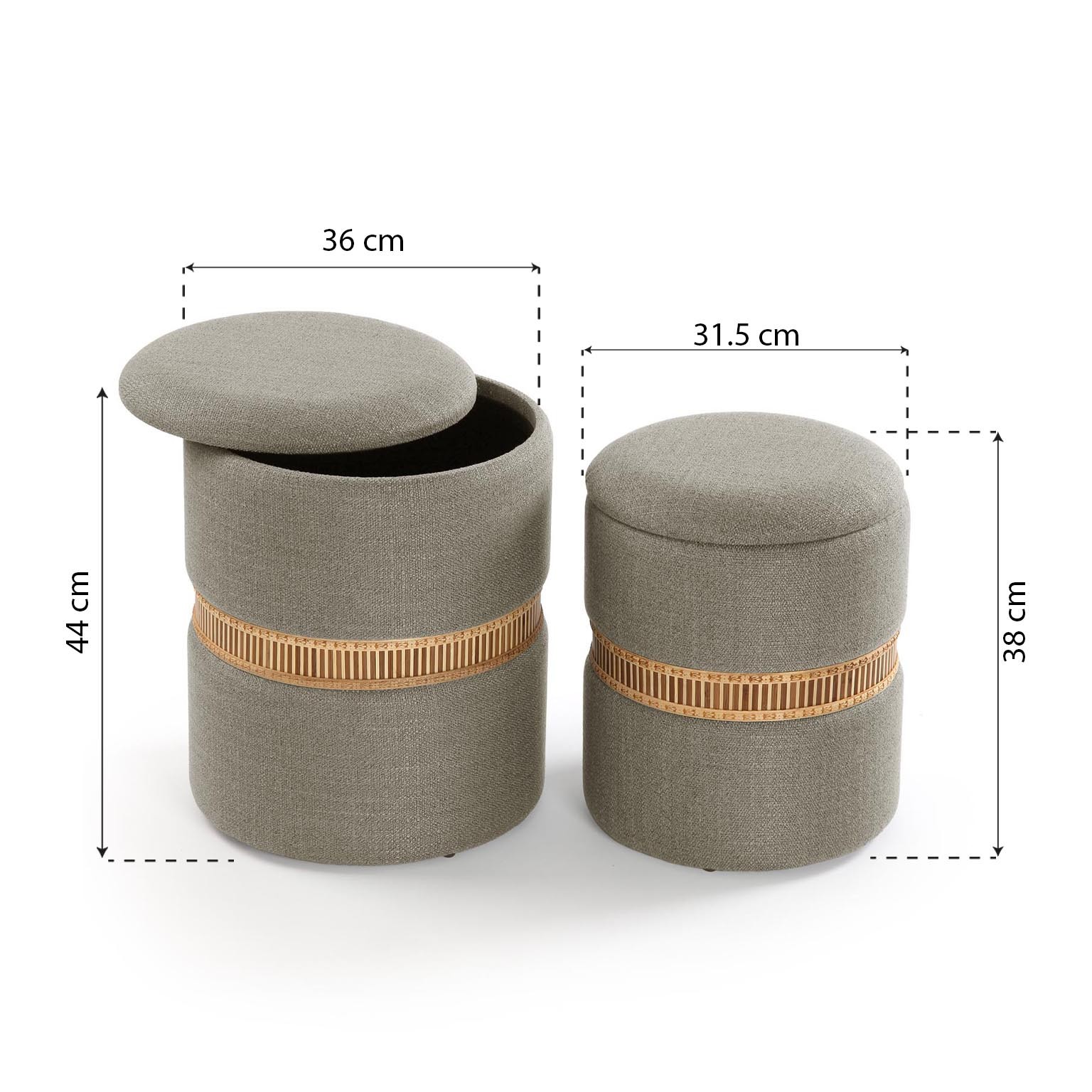 O detalhe do anel em bambu confere um toque natural, tornando-os ideais para salas de estar, quartos ou halls de entrada, onde podem servir como assentos adicionais ou espaço de armazenamento.