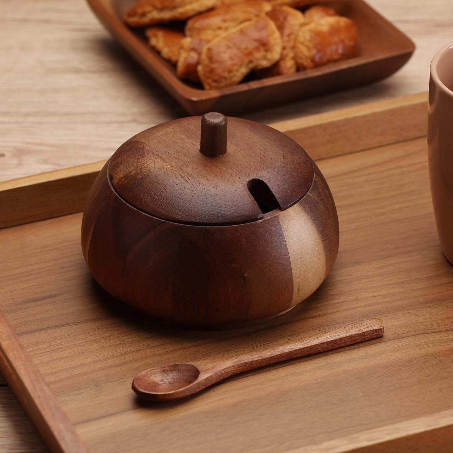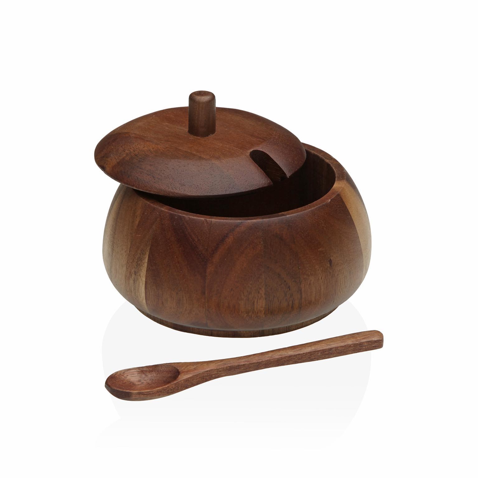 O açucareiro redondo em madeira de acácia é uma peça funcional e estética, ideal para armazenar açúcar em ambientes de cozinha ou sala de jantar.