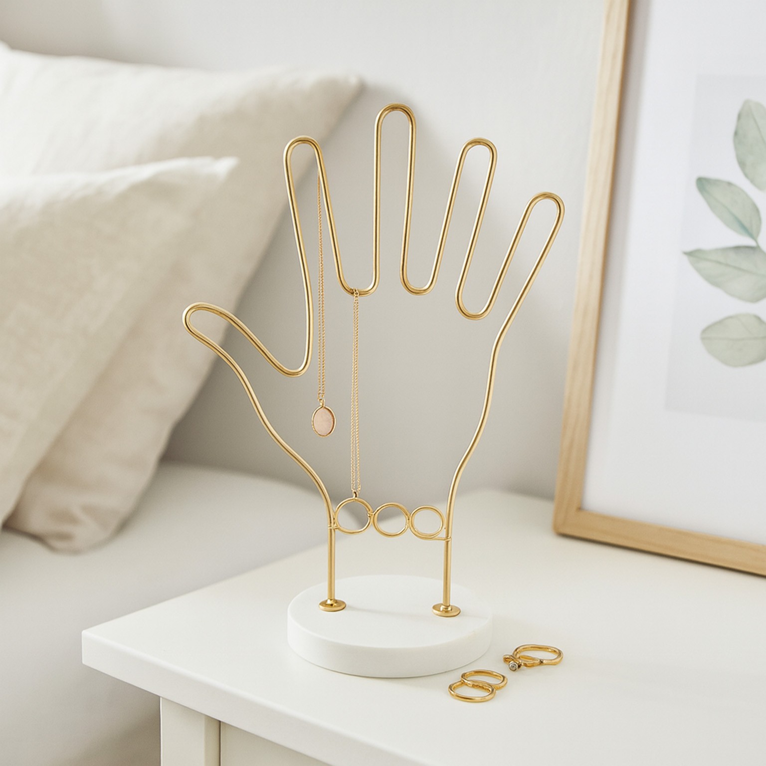 Joalheiro Metálico Dourado em Forma de Mão, com 26 cm de altura, 10 cm de largura e 18 cm de comprimento, é uma peça decorativa que combina funcionalidade e estilo.