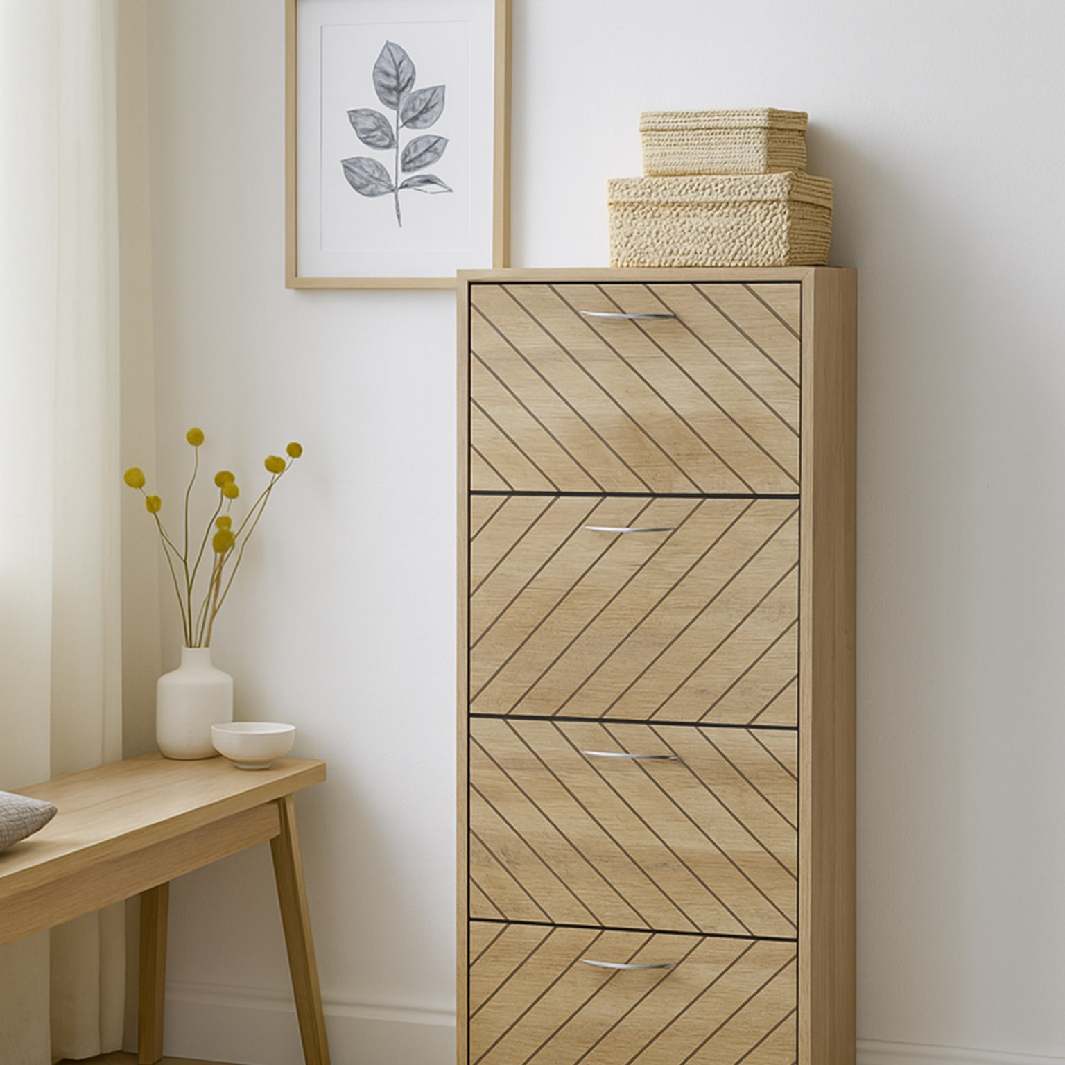A sapateira de 4 gavetas é um móvel auxiliar funcional e moderno, ideal para organizar calçados em entradas, corredores ou quartos.