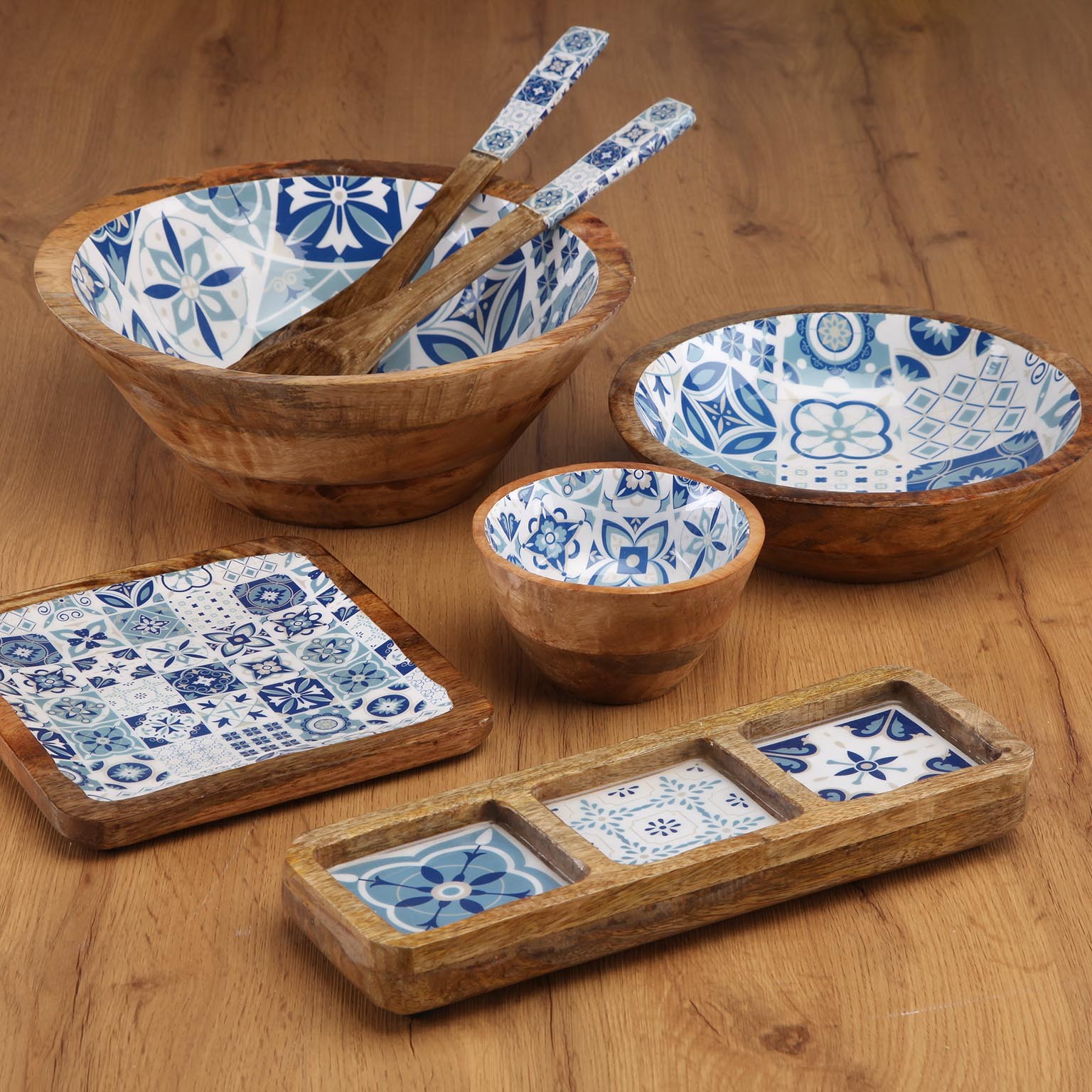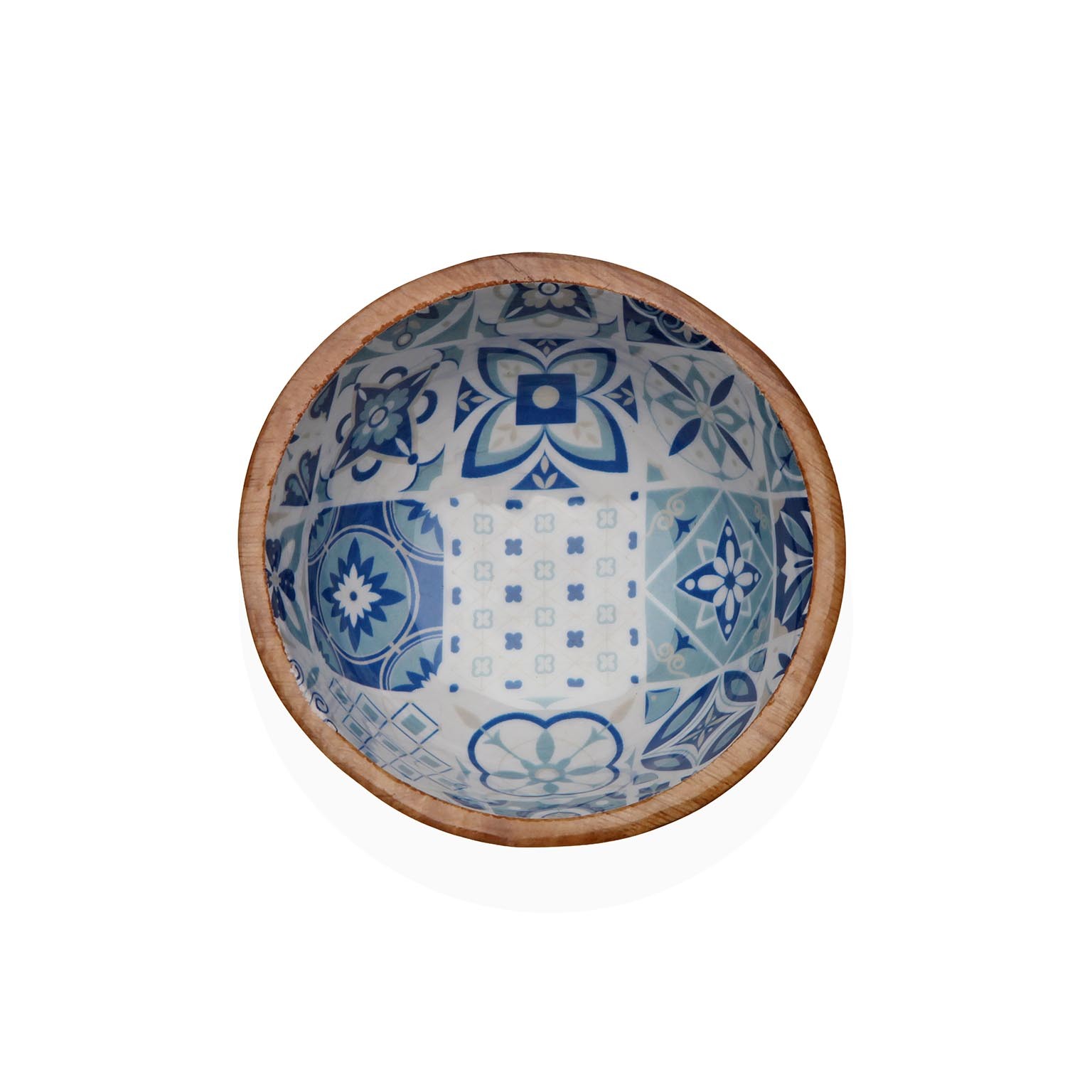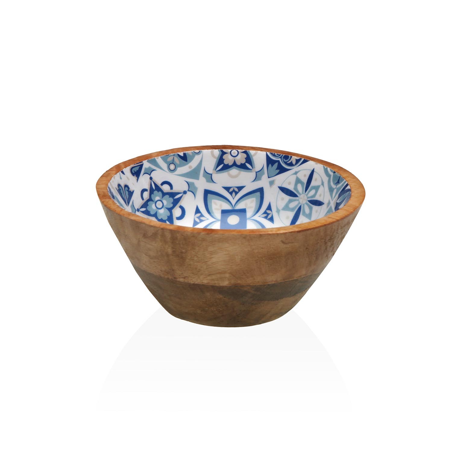A tigela esmaltada Azurita combina a beleza da madeira de manga com um interior esmaltado em tons de azul e branco, criando uma peça única para servir ou apresentar.