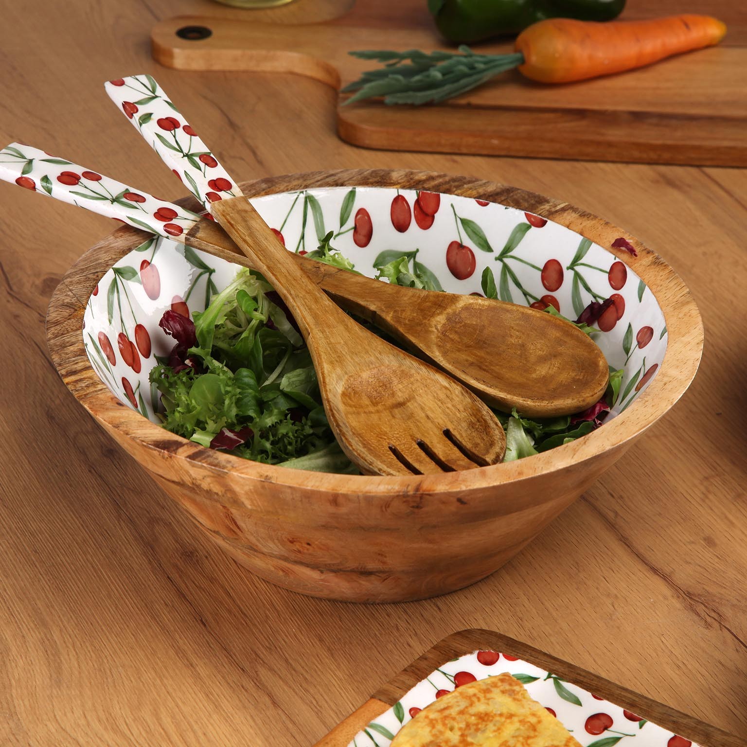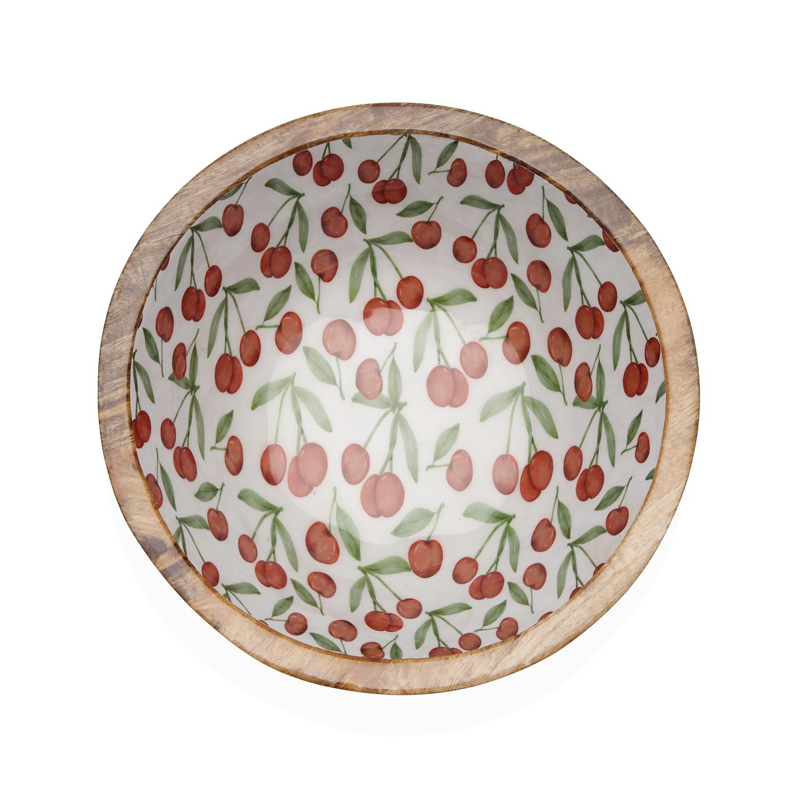 A parte externa é elaborada em madeira de manga, enquanto o interior em porcelana apresenta um encantador padrão de cerejas em vermelho e verde.