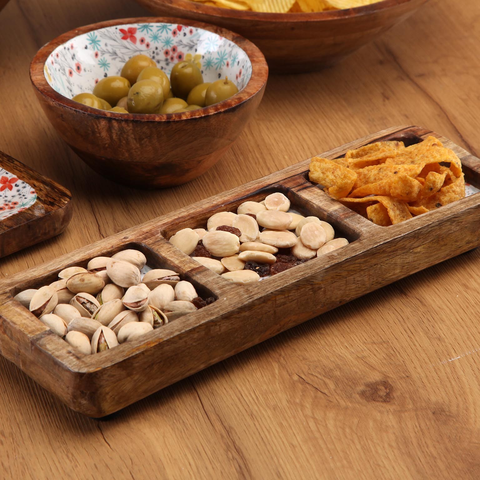 A travessa três compartimentos Fiorella, em madeira de manga, combina funcionalidade e estética.