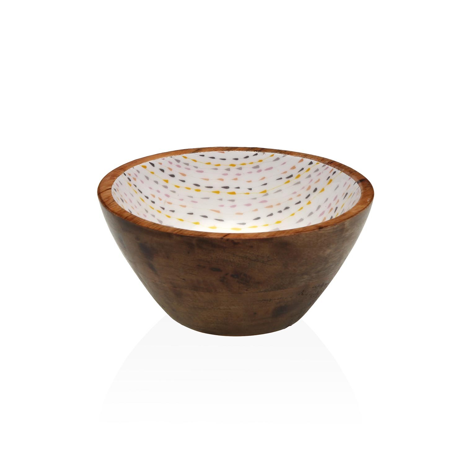 A tigela esmaltada Nordic Drops combina a beleza natural da madeira de manga com um interior vibrante em esmalte, apresentando tons suaves de branco, amarelo, rosa e azul.
