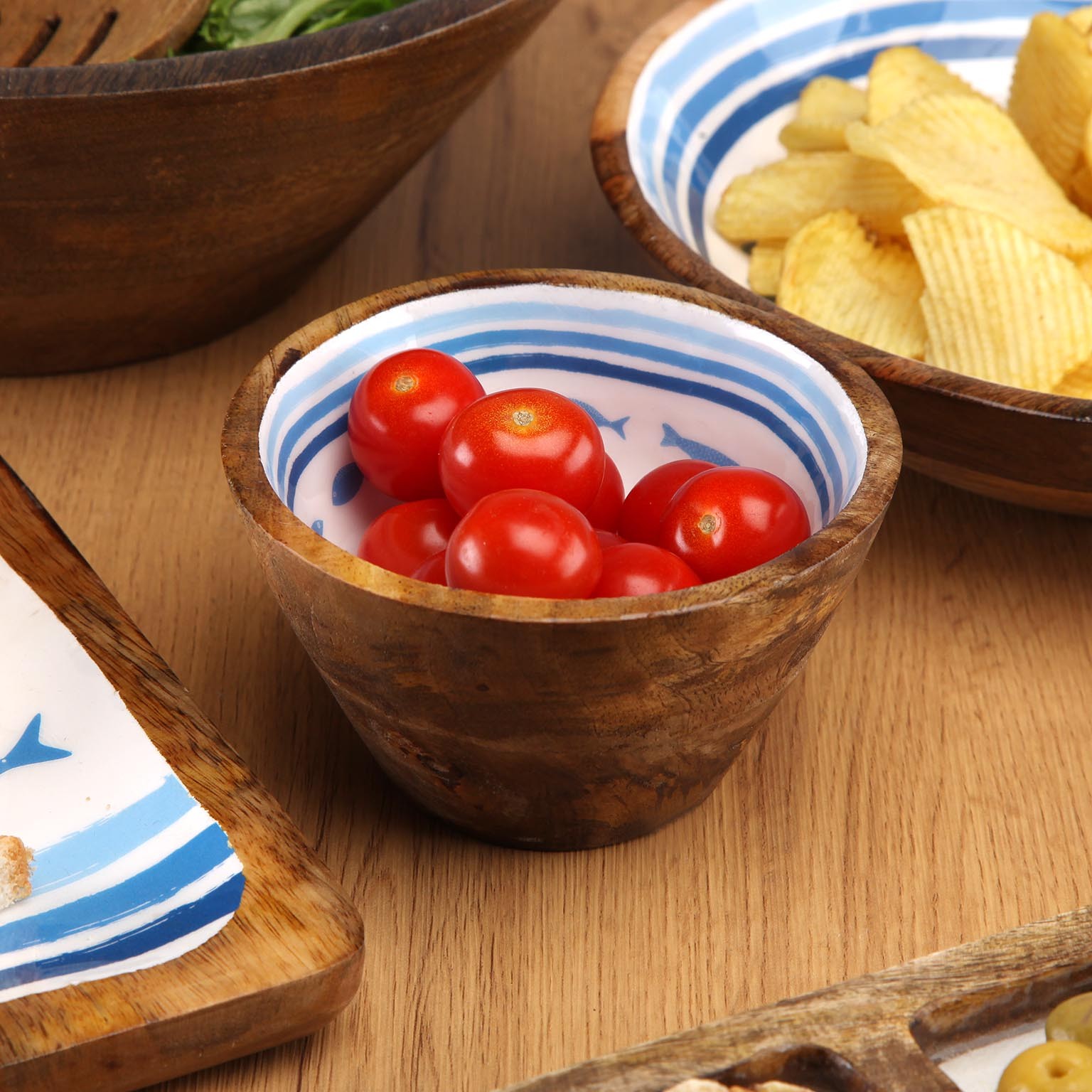 A tigela esmaltada Oceanic combina a elegância da madeira de manga com a suavidade do esmalte, apresentando um design lúdico em tons de azul com ilustrações de peixes.
