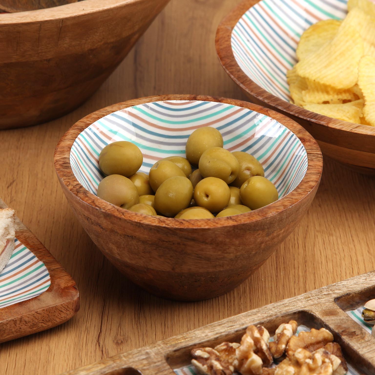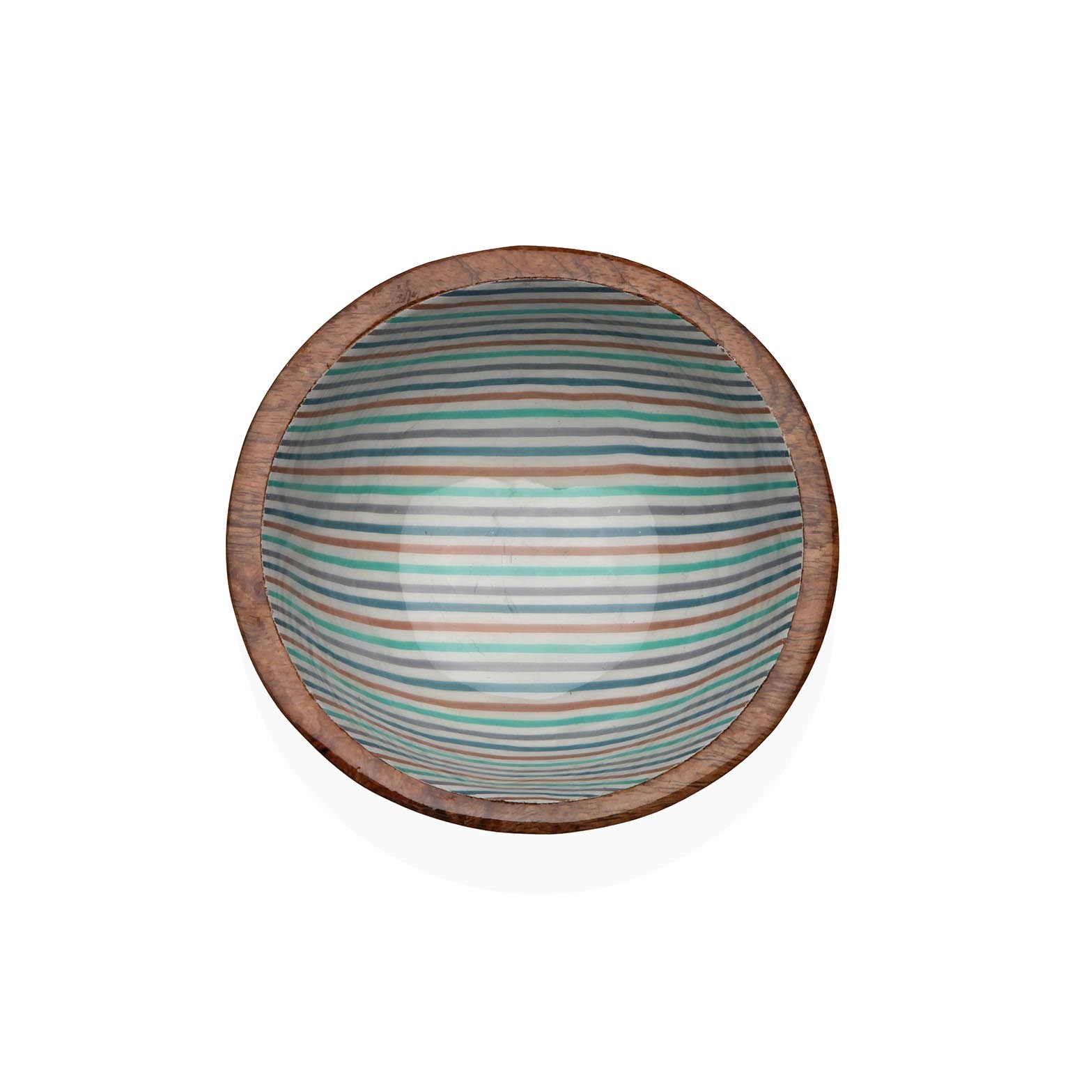 A tigela esmaltada riscas combina a beleza da madeira de manga com um interior em esmalte vibrante, apresentando listras em azul, verde e branco.