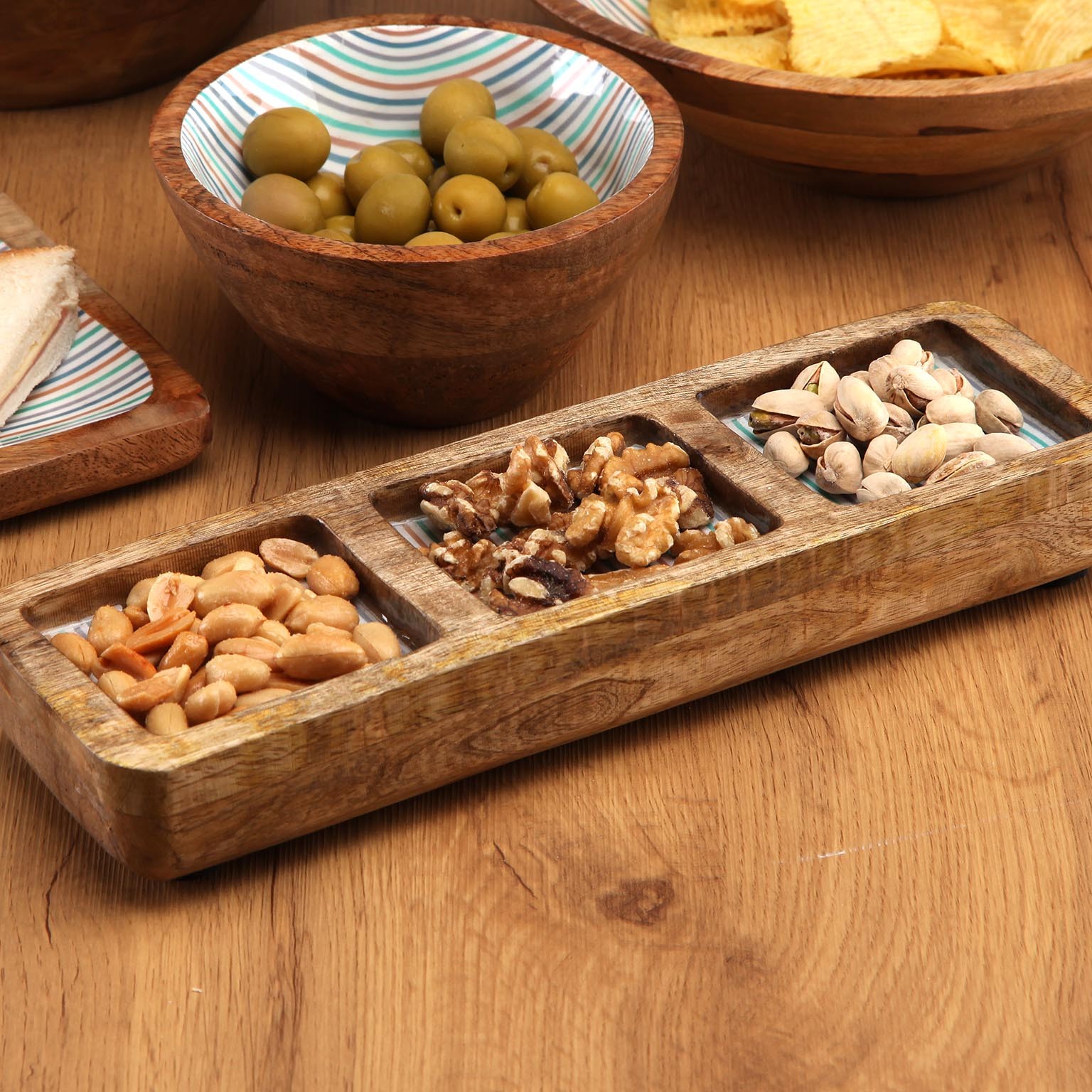 A travessa três compartimentos riscas é uma peça versátil e funcional, ideal para servir aperitivos e petiscos em diversas ocasiões.