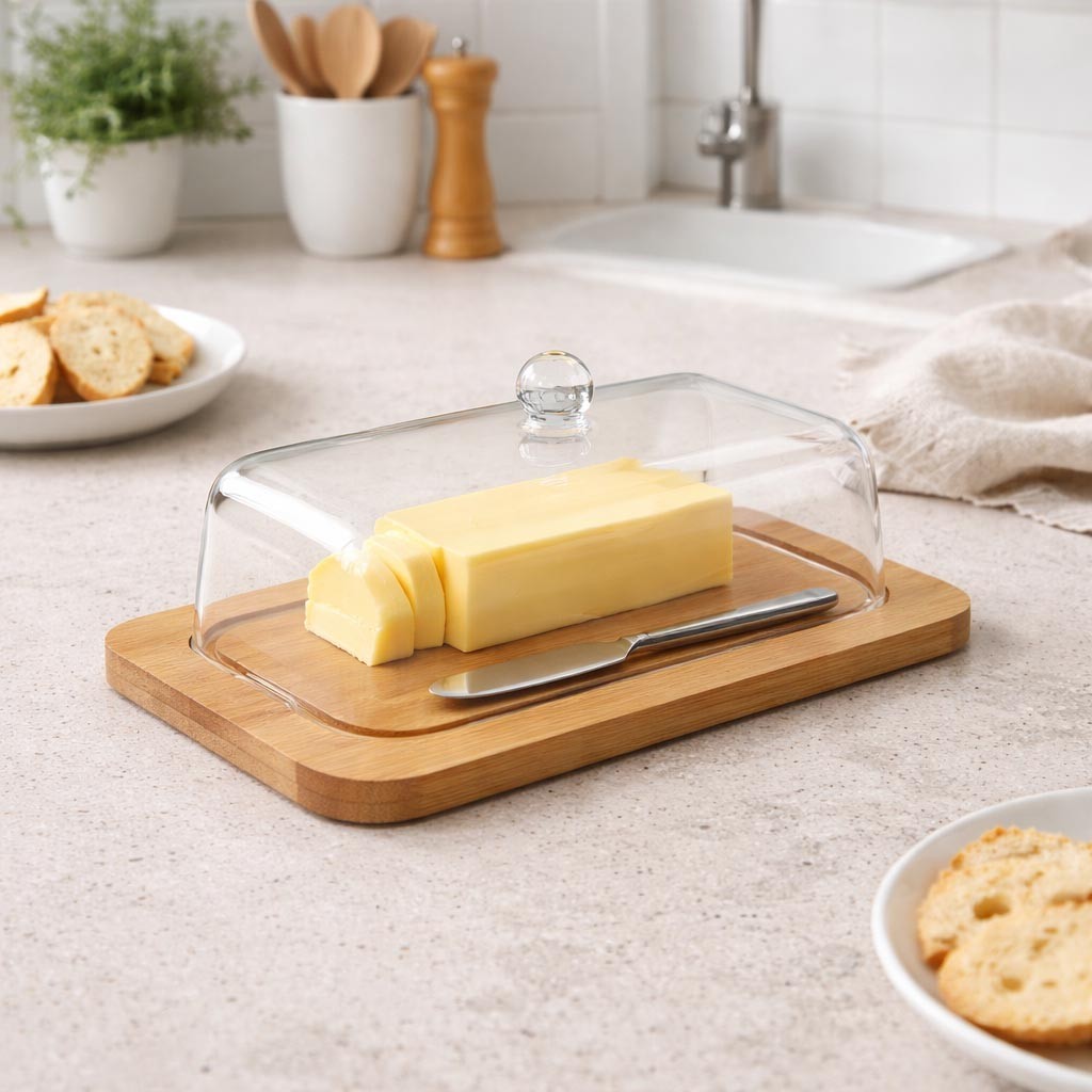 O prato manteigueira em bambu é um utensílio de cozinha que combina funcionalidade e estética.