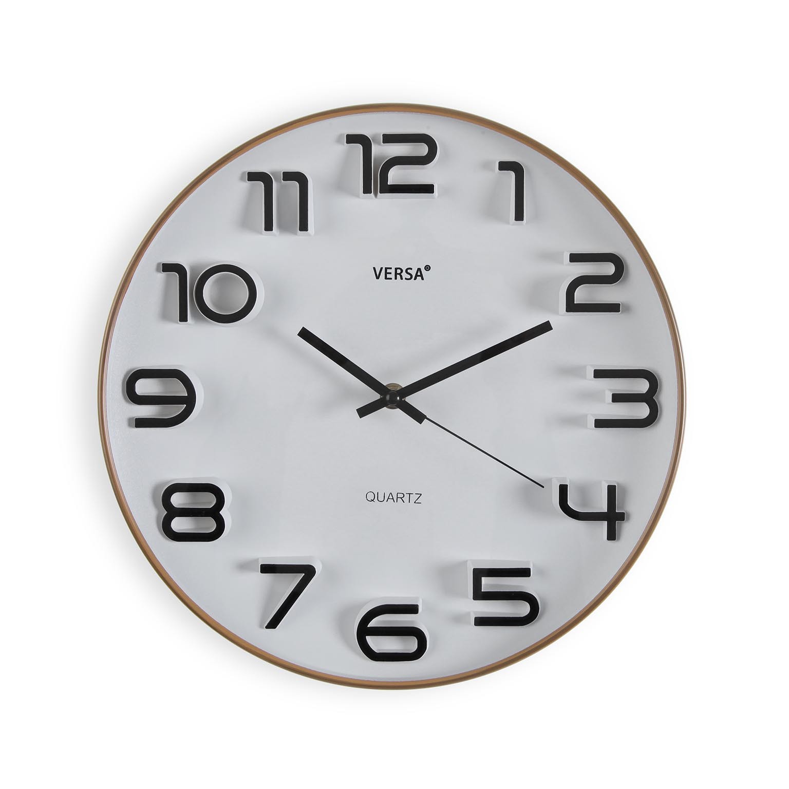 Com estrutura em plástico e mostrador em vidro, apresenta um design moderno e minimalista, com números e ponteiros em preto e detalhes em dourado.