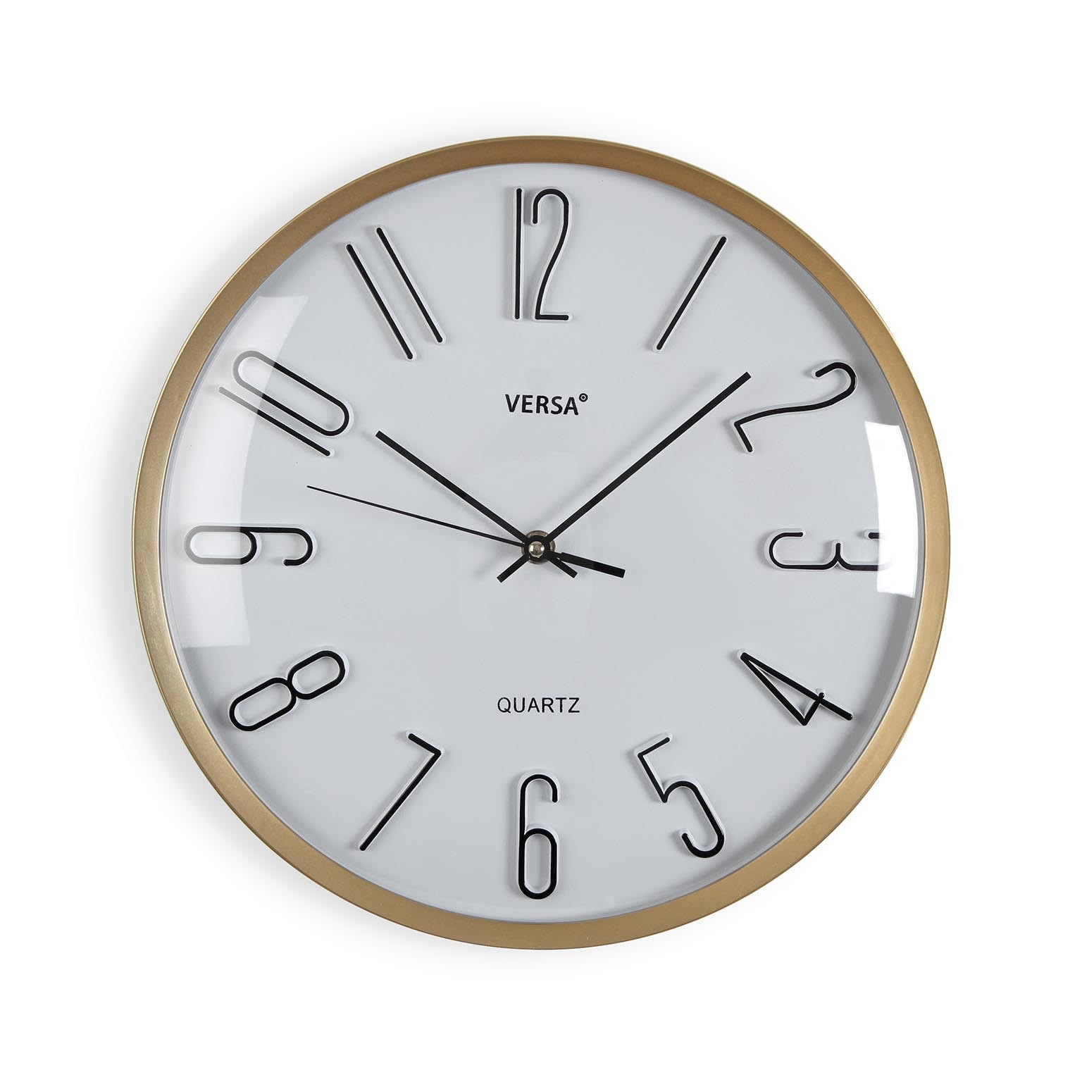 Fabricado em plástico, apresenta um mostrador protegido por vidro, com números e ponteiros em preto e uma moldura dourada.