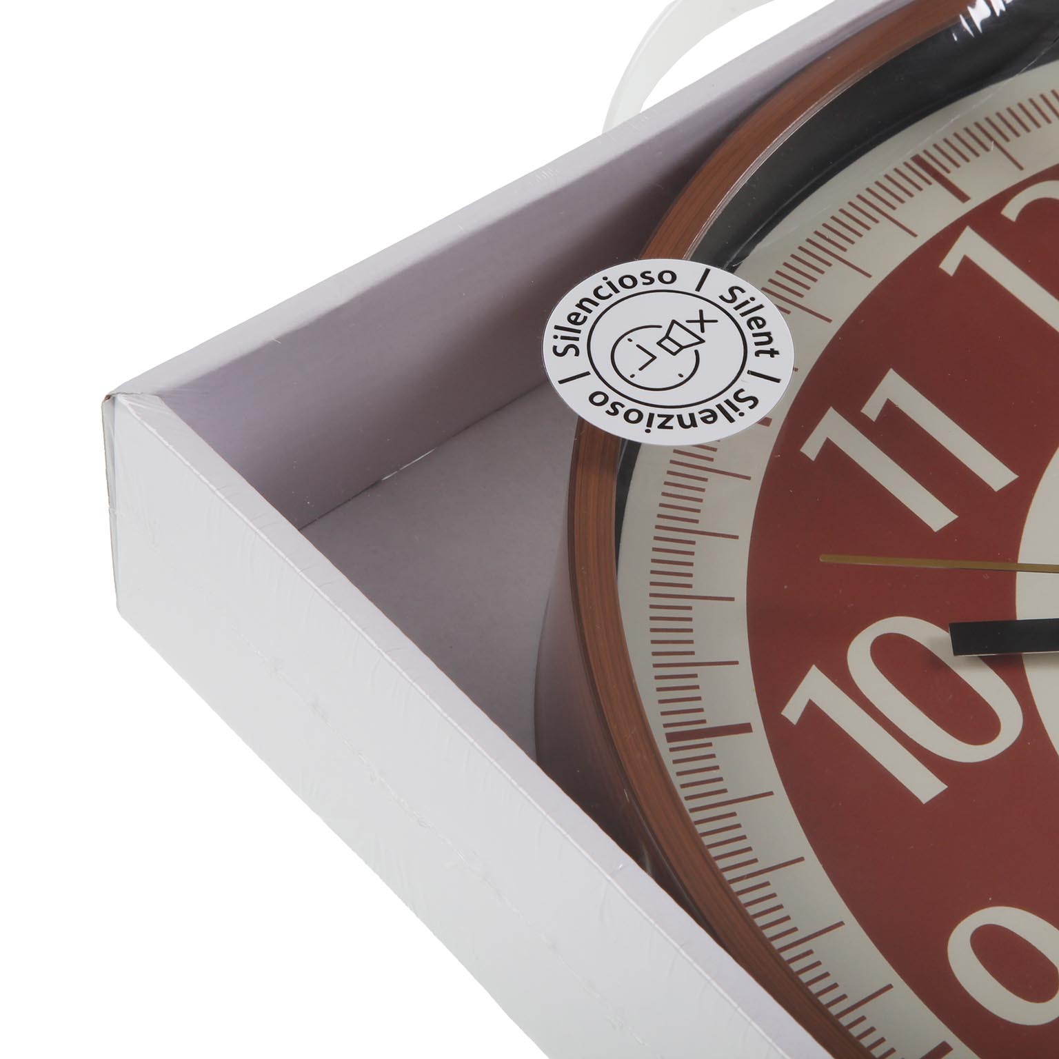 Fabricado em plástico leve e durável, apresenta um design moderno com fundo vermelho e números em creme, complementado por ponteiros em preto e dourado.