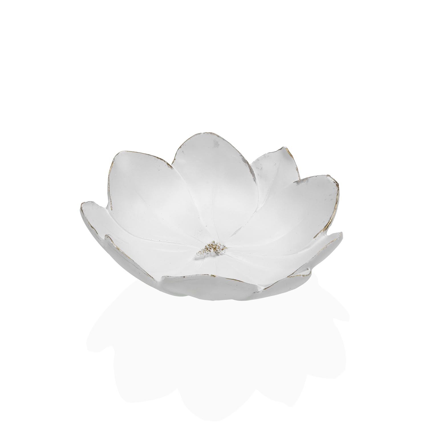 Centro de mesa em forma de flor branca, confeccionado em resina, com dimensões de 4,5 cm de altura e 17 cm de largura e comprimento.