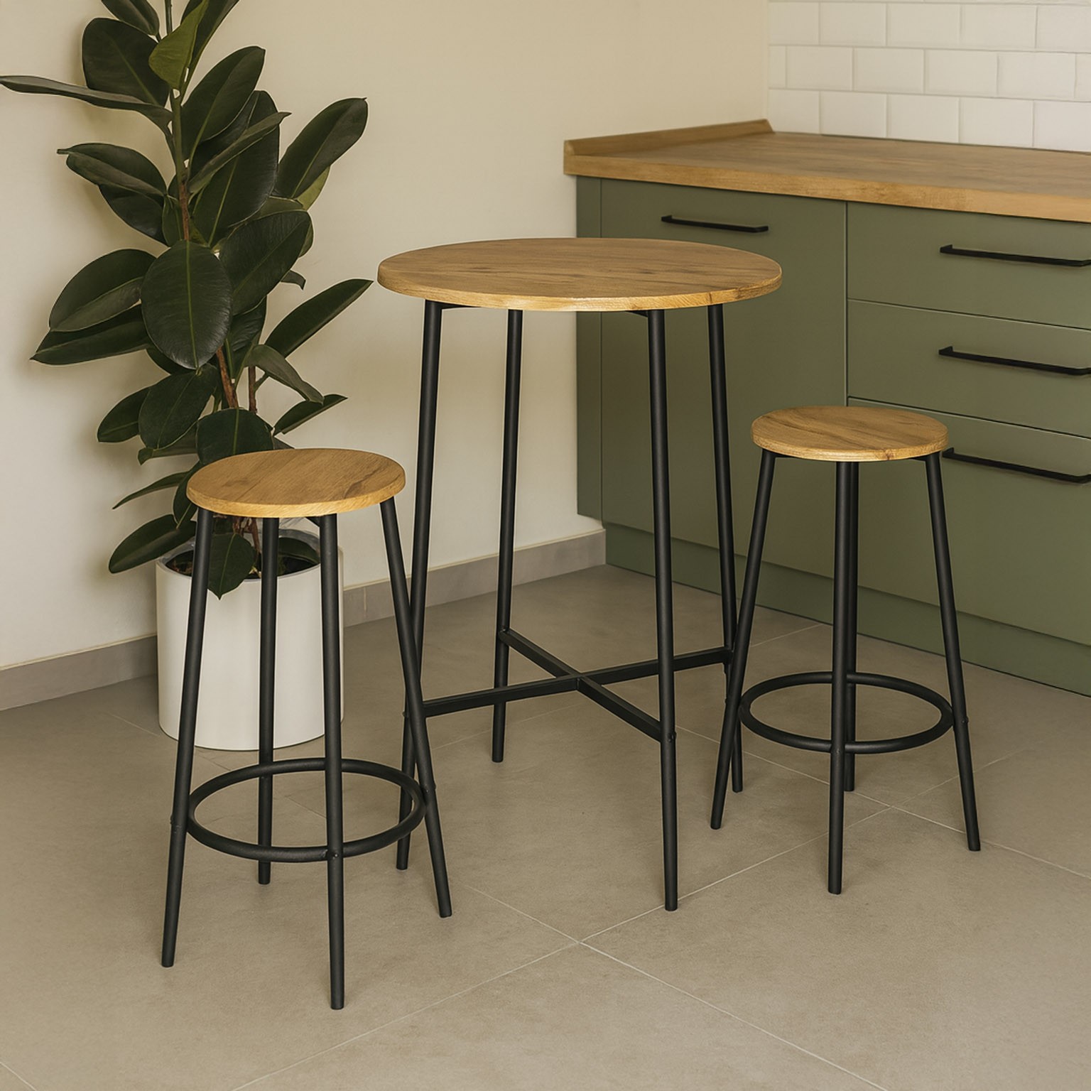 Este conjunto de mesa alta e duas cadeiras é uma adição funcional e estilosa para qualquer cozinha ou área de refeições compacta.