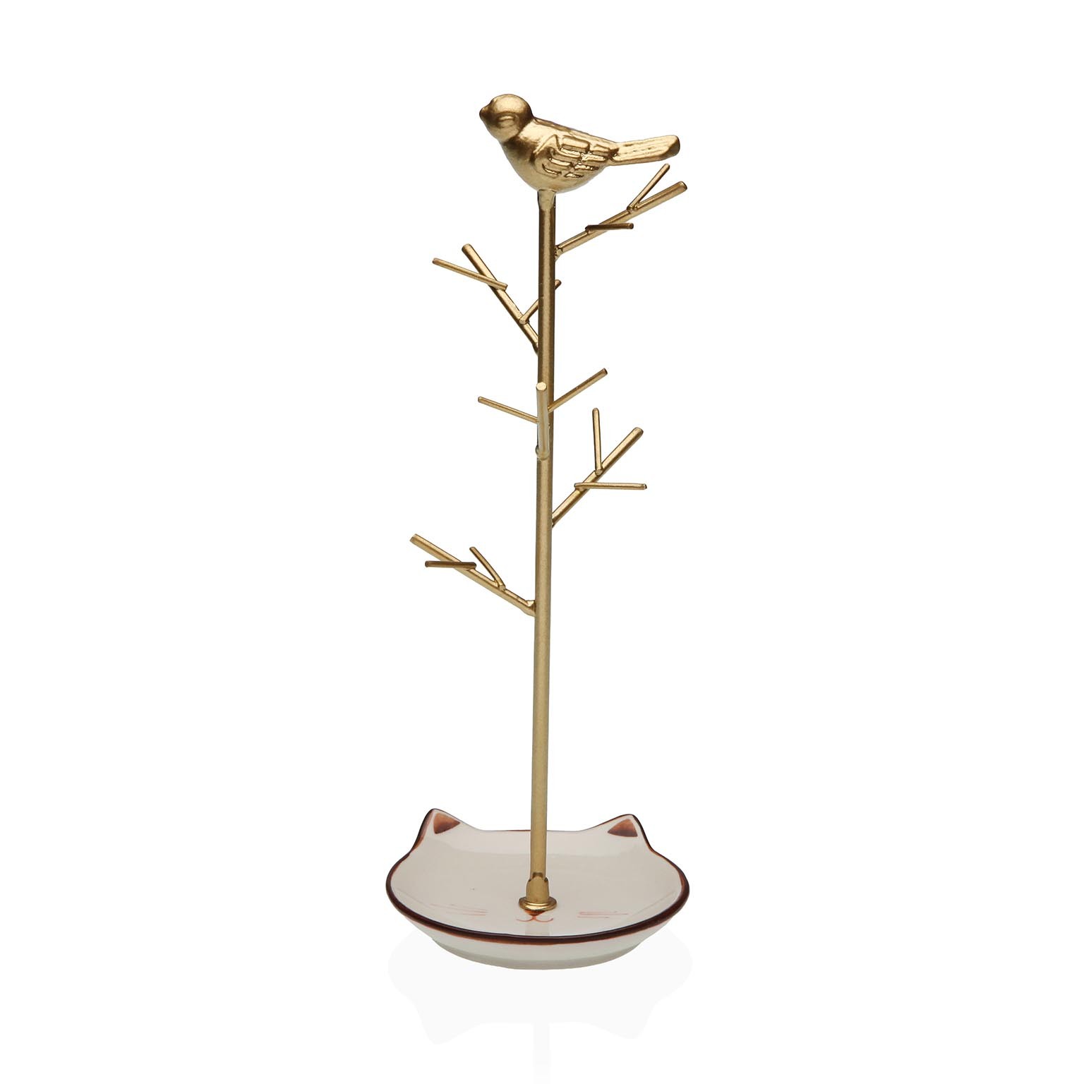 O suporte de joias dourado com pássaro é uma peça decorativa que combina funcionalidade e estilo.