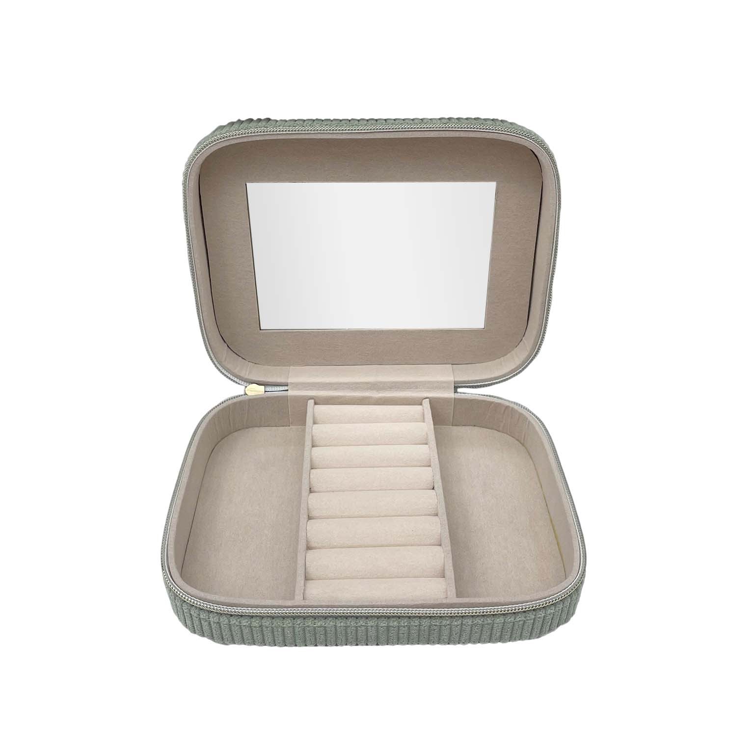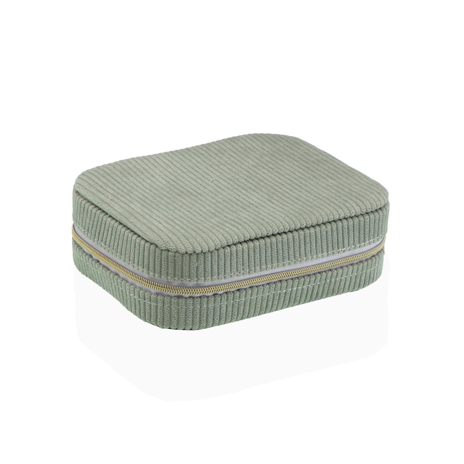 A caixa de joias em veludo verde menta é uma peça elegante e funcional, ideal para o armazenamento de joias e acessórios pessoais.