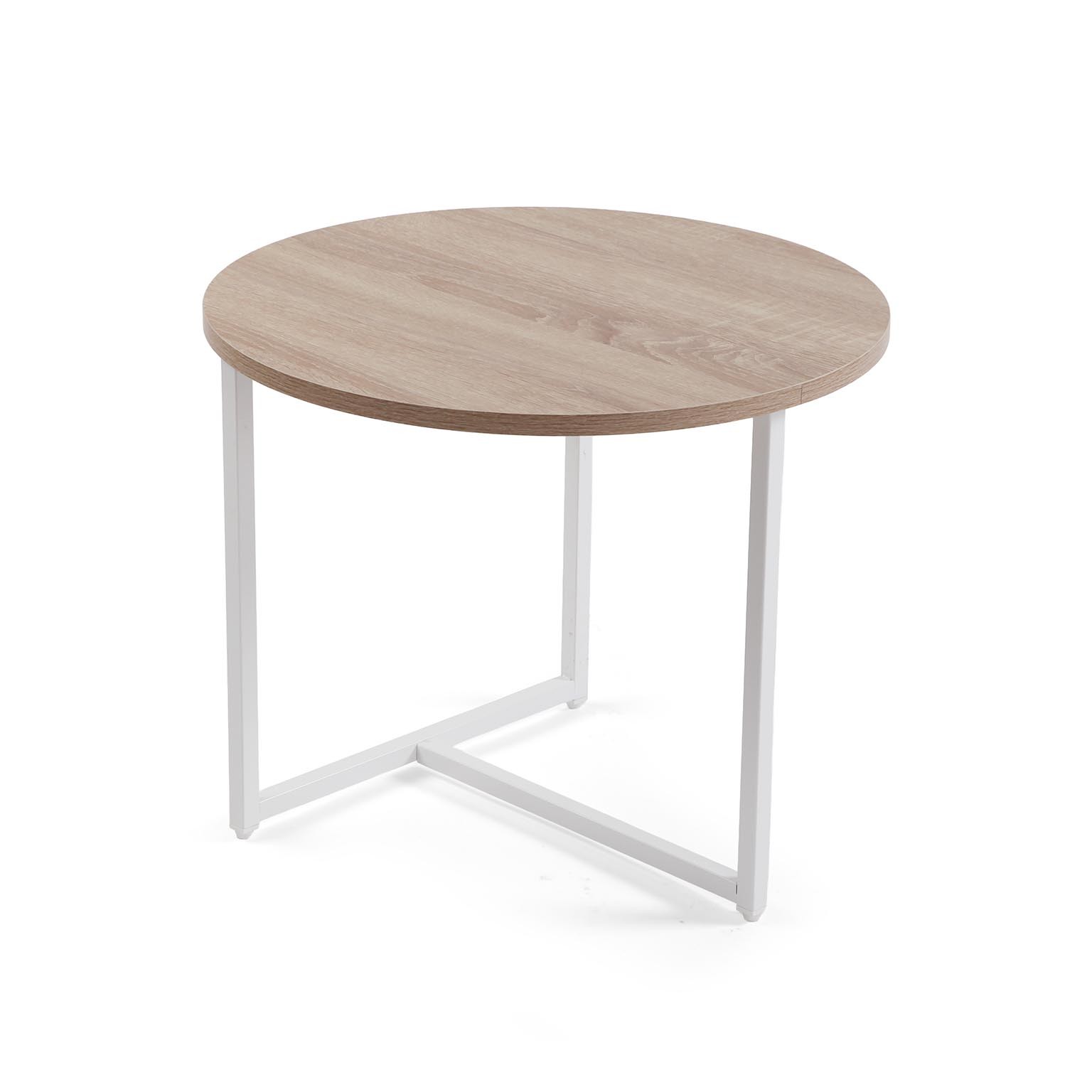 Com estrutura em metal pintado de branco e tampo em madeira clara, estas mesas medem 40 cm de altura e 48 cm de largura e comprimento, proporcionando versatilidade na disposição.