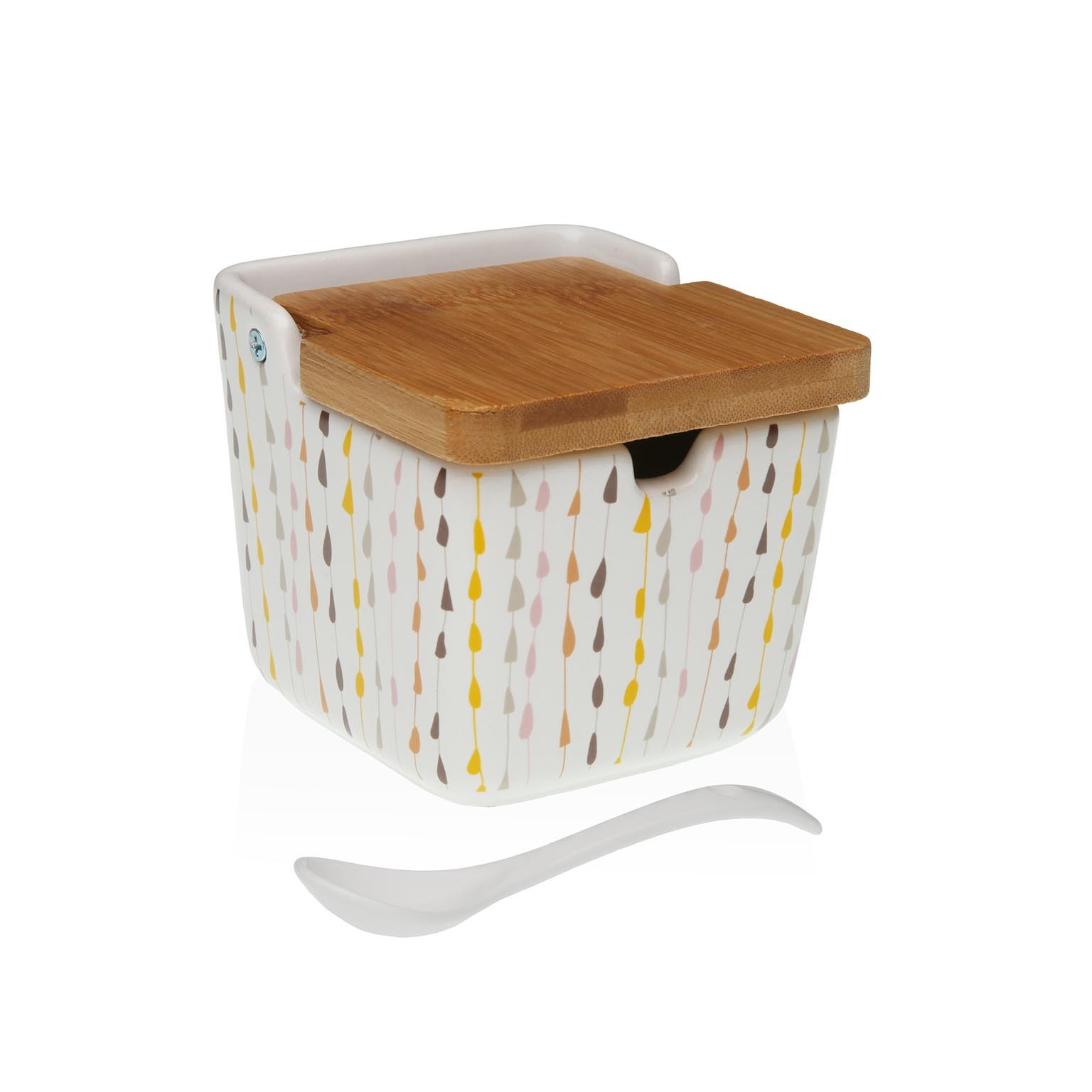O açucareiro Nordic Drop combina funcionalidade e estilo moderno, apresentando um corpo em cerâmica branca e uma tampa em madeira que adiciona um toque natural.