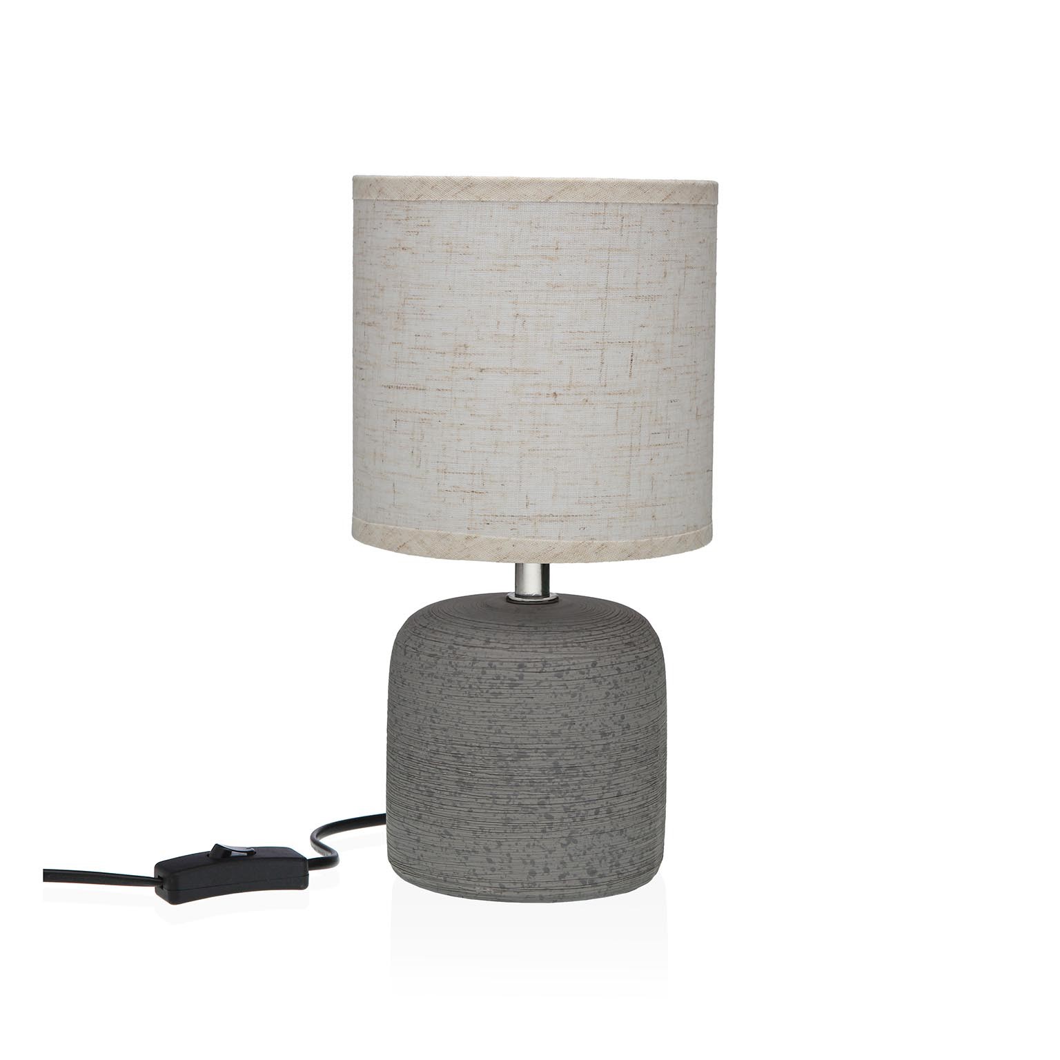 O candeeiro de mesa Brave em cinza escuro combina uma base em cerâmica com uma tulipa de tela, criando um elemento decorativo moderno e minimalista.