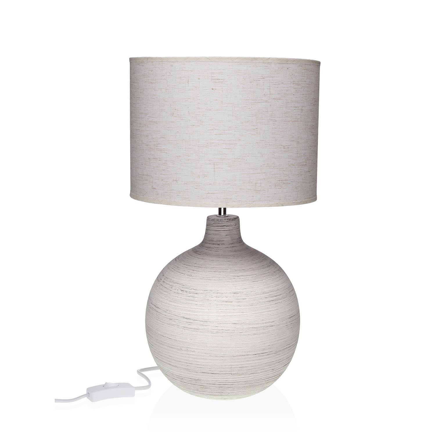 O candeeiro de mesa Neo destaca-se pela sua base em cerâmica e tulipa em tecido, apresentando um design moderno e elegante.