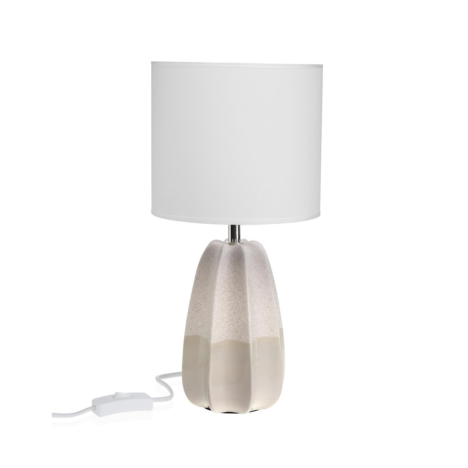 O candeeiro de mesa Hera combina uma base em cerâmica com uma tulipa de tela, criando uma peça decorativa que se destaca pela sua estética minimalista e contemporânea.