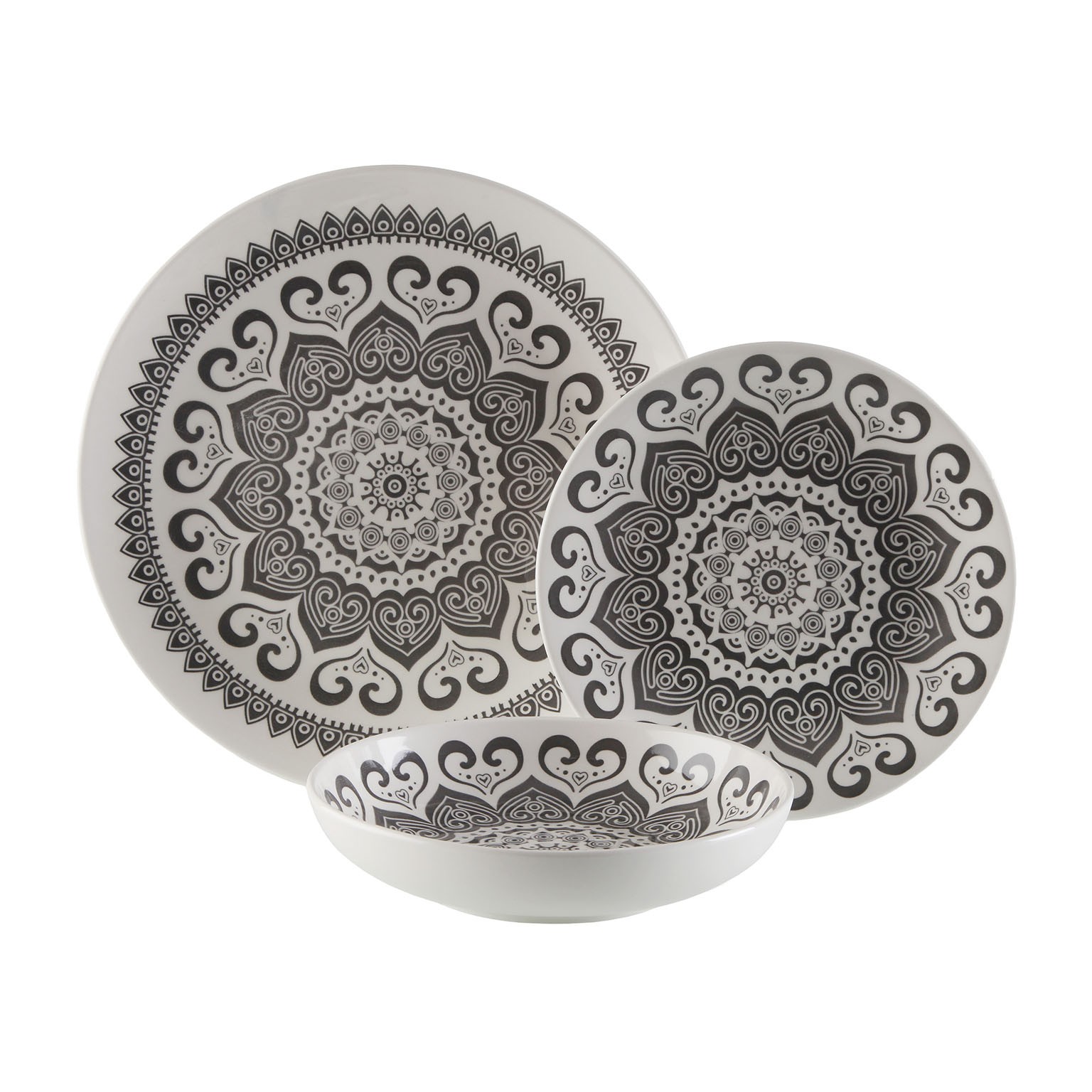Fabricado em porcelana, este conjunto destaca-se pelos seus padrões étnicos em tons de branco e preto, conferindo um toque artístico aos espaços do lar.