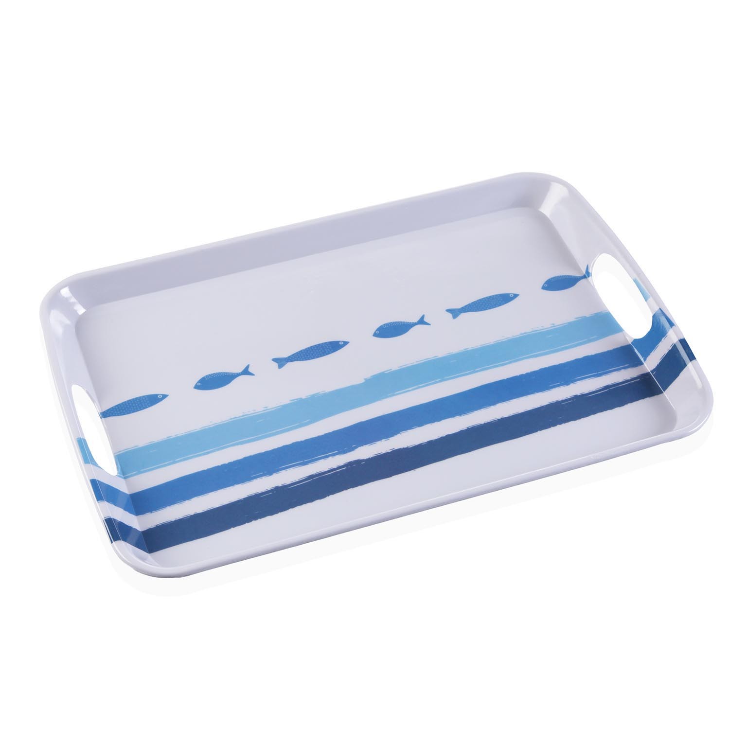 A bandeja grande Oceanic, confeccionada em melamina, apresenta um design encantador em tons de azul e branco, evocando o estilo mediterrânico com elementos náuticos.