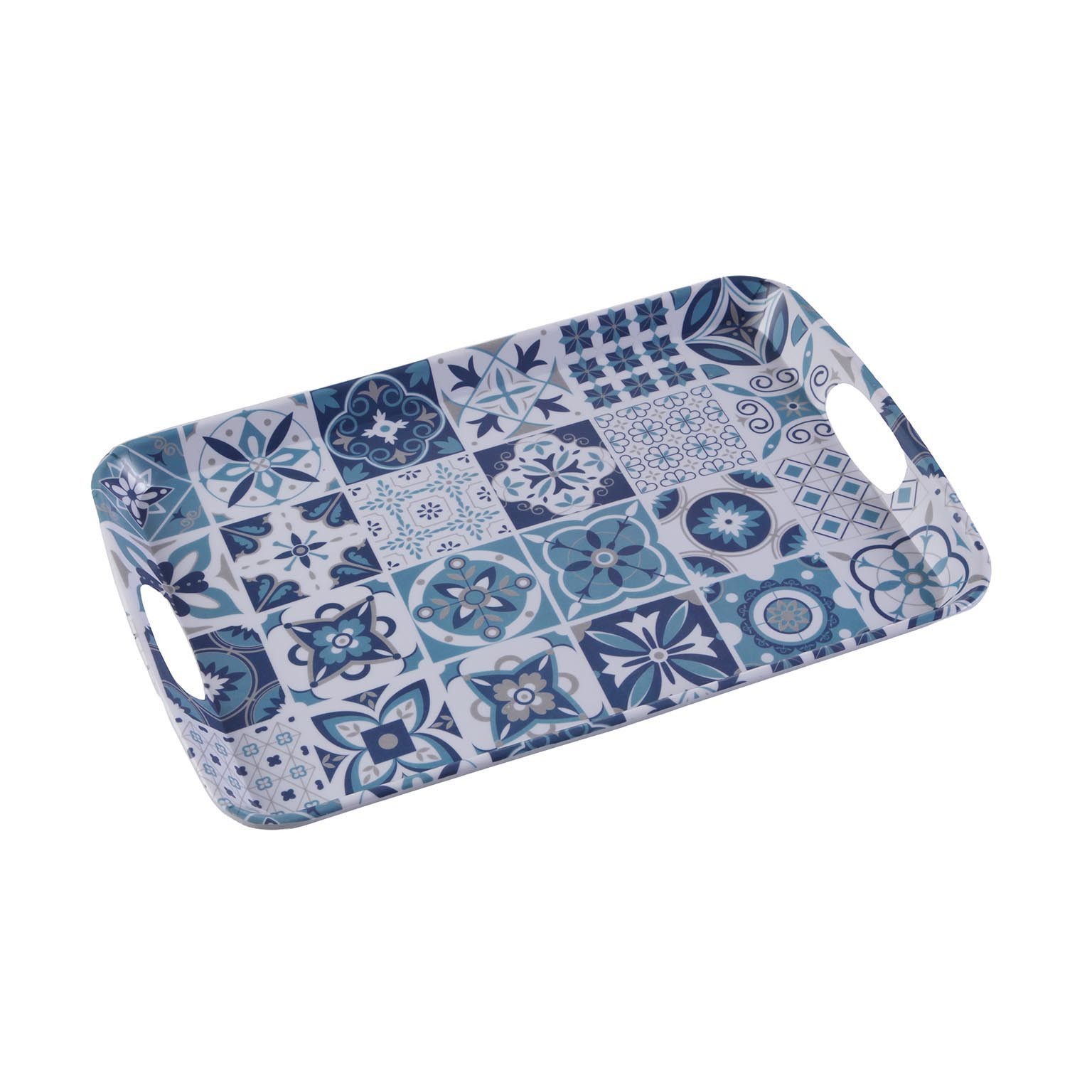 A bandeja Azurita pequena, confeccionada em melamina, apresenta um design elegante em tons de azul e branco, com detalhes em cinza que evocam o estilo mediterrânico.