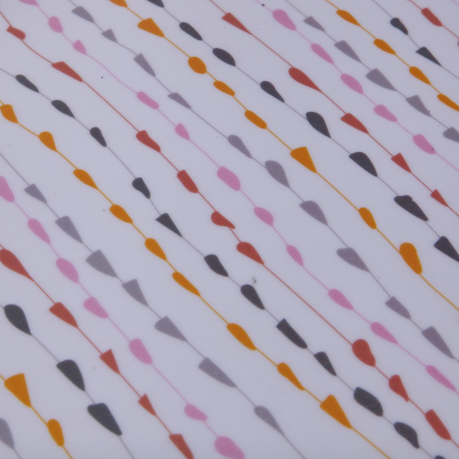 Com dimensões de 42 cm de comprimento, 27,4 cm de largura e 2,3 cm de altura, apresenta um design moderno em tons de branco, complementado por padrões alegres em rosa, laranja, cinza e amarelo.