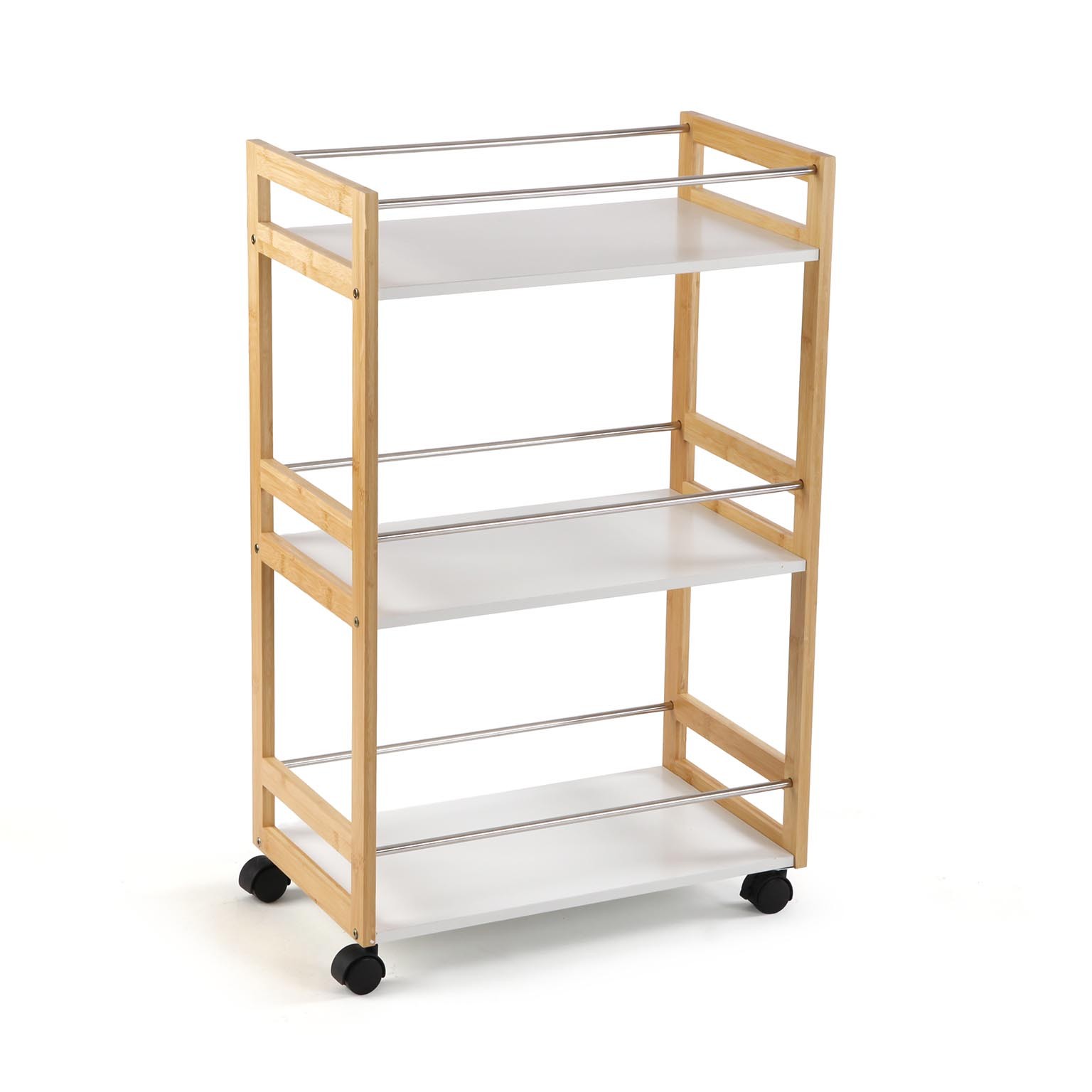 O carrinho de cozinha com 3 prateleiras em branco e bambu combina funcionalidade e estilo moderno.