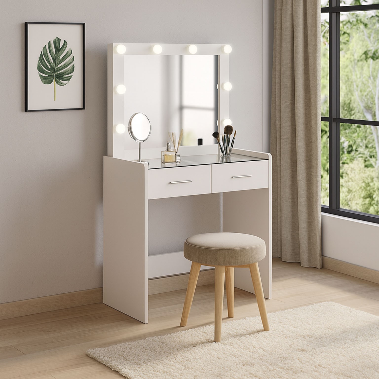 A sua estrutura em melamina, espelho de vidro e iluminação LED proporcionam um ambiente luminoso e prático, perfeito para a preparação pessoal ou como mesa de trabalho.