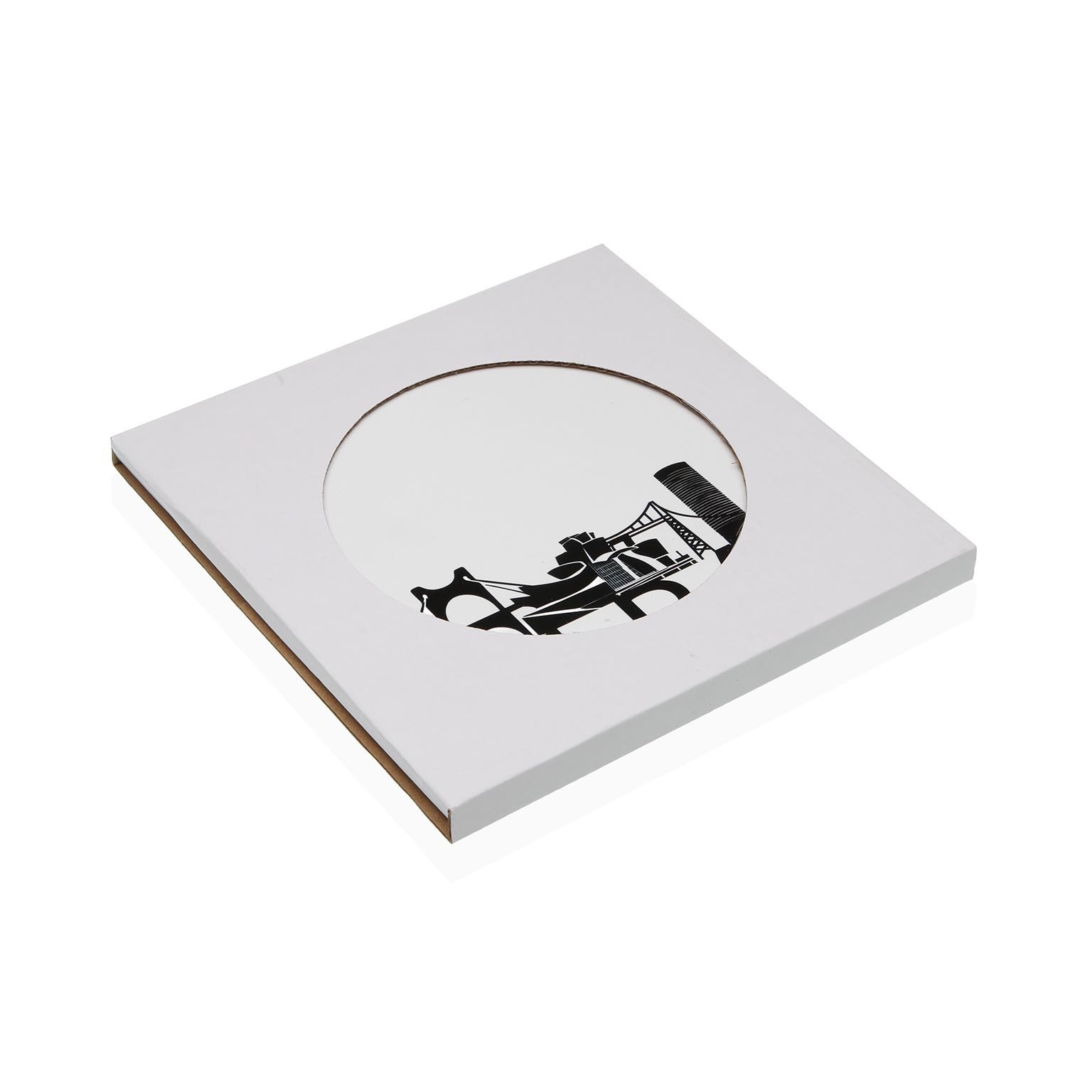 Com dimensões de 20x20 cm, apresenta um design moderno que destaca a silhueta de Madrid em preto sobre um fundo branco.
