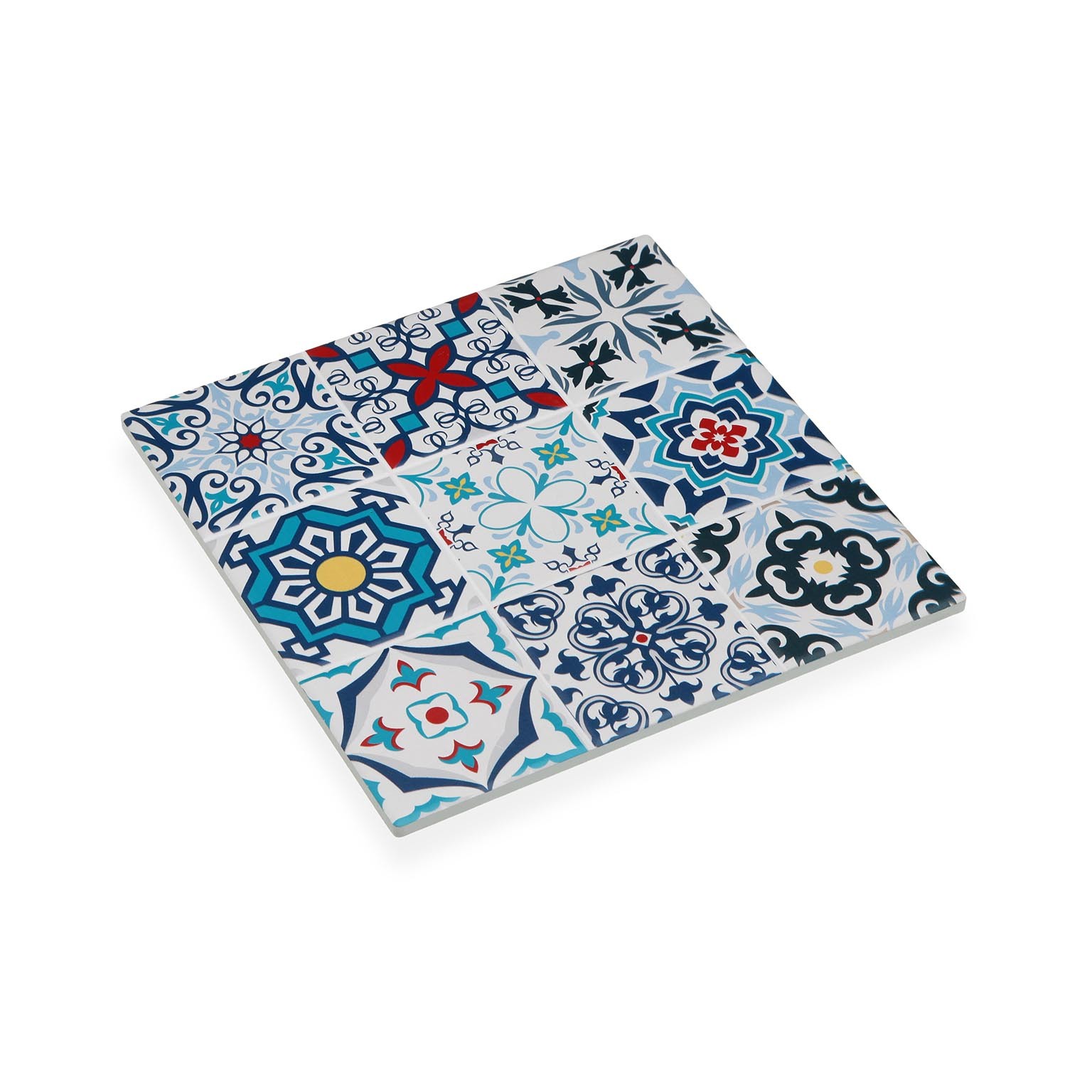 Com dimensões de 20 cm x 20 cm, destaca-se pelo seu estilo mediterrânico, adornado com padrões vibrantes em azul, branco e toques de vermelho e verde, que conferem um charme cultural.