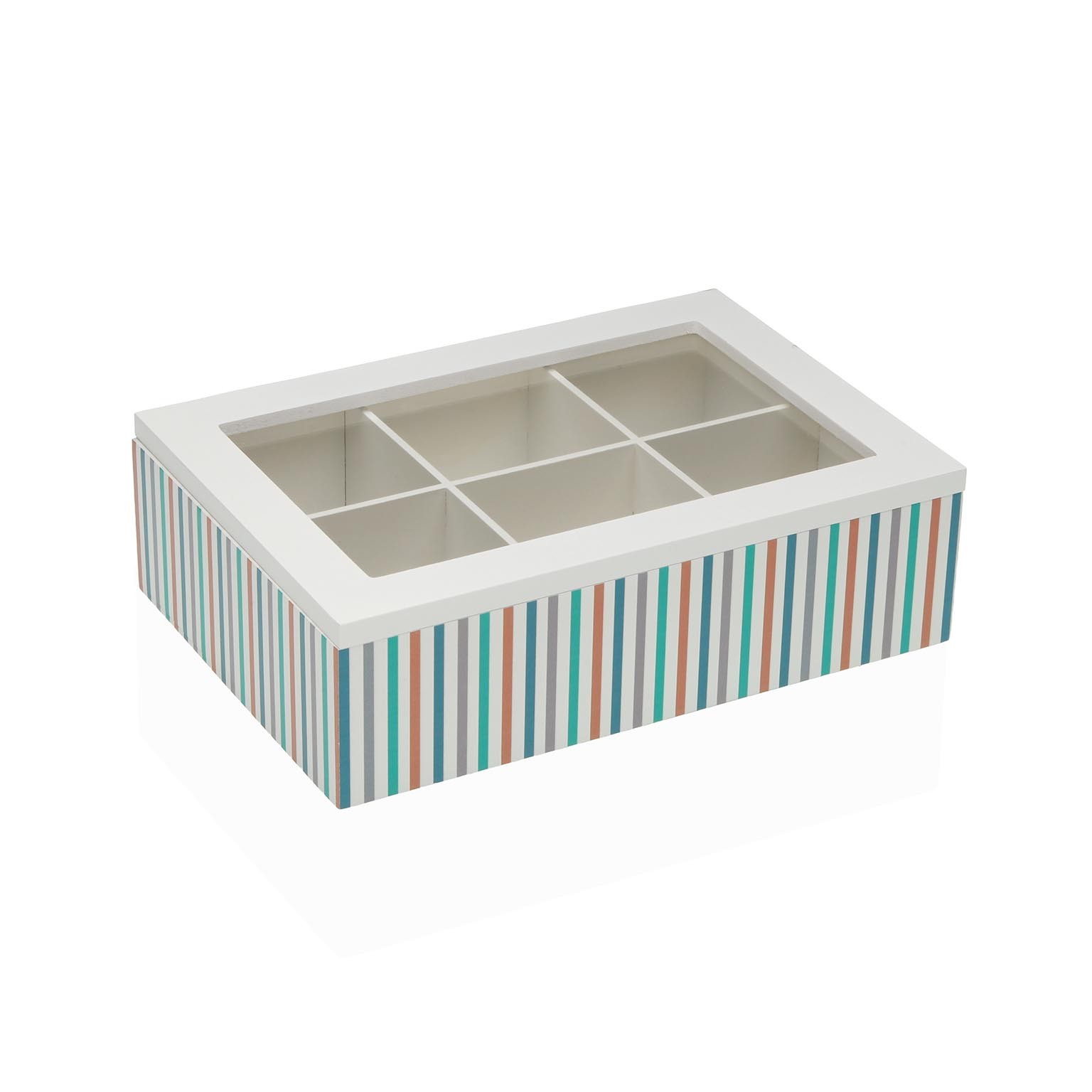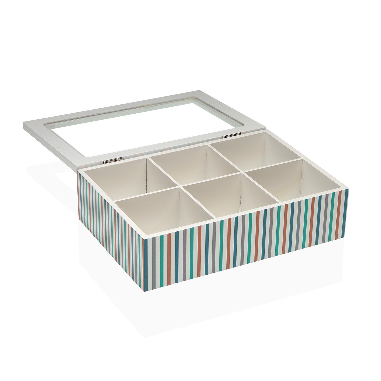 A caixa de chá risca com 6 compartimentos é uma solução prática e elegante para a organização de chás e pequenos itens.