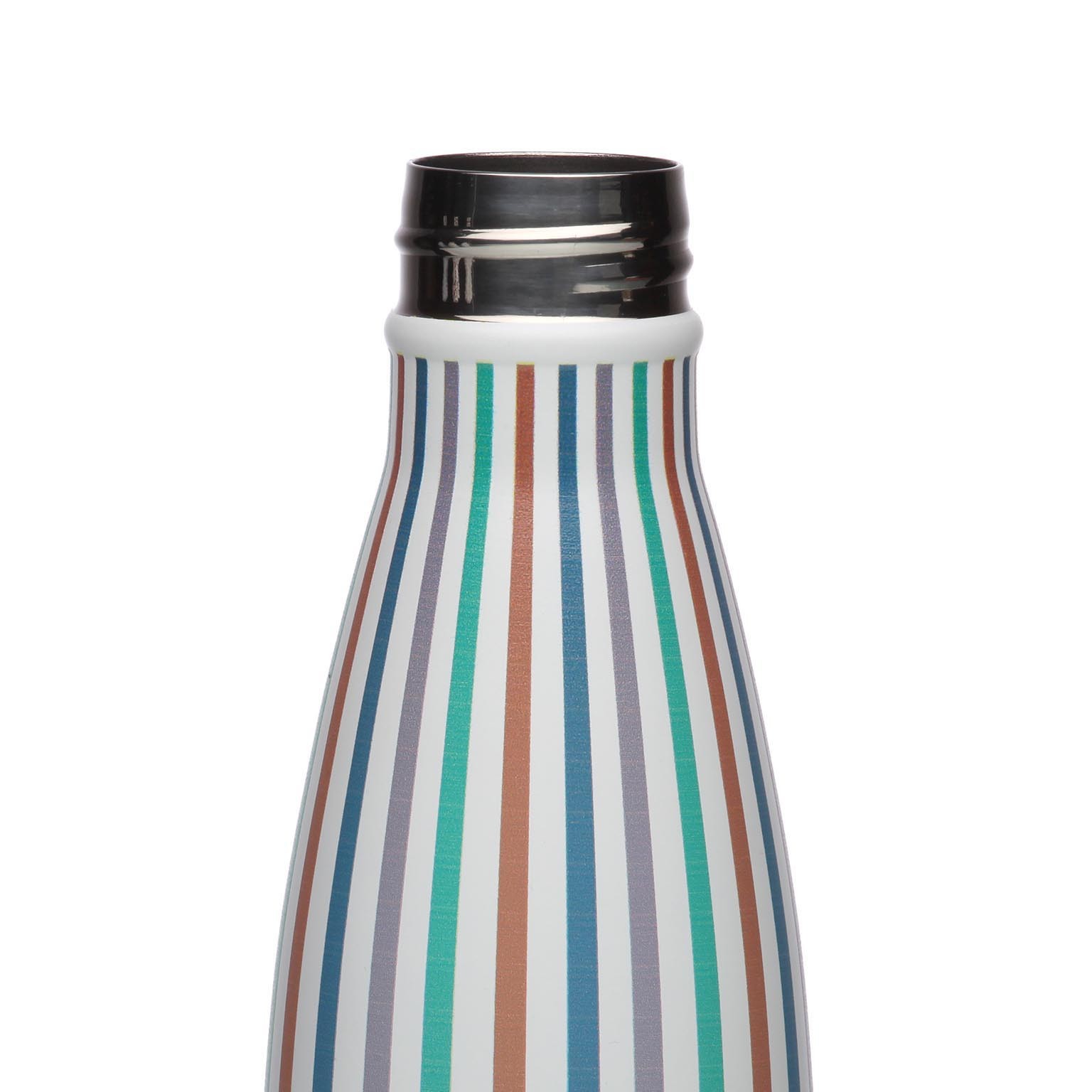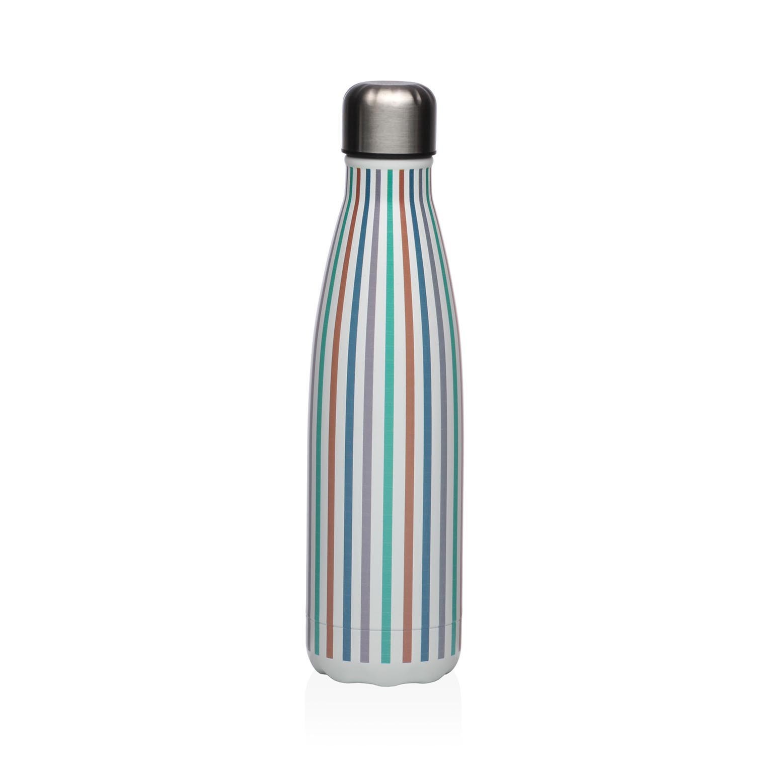 Com um design moderno em branco, adornado com riscas vibrantes em azul, verde, laranja, marrom e roxo, esta garrafa de 27 cm de altura e 7 cm de largura combina funcionalidade e estilo.