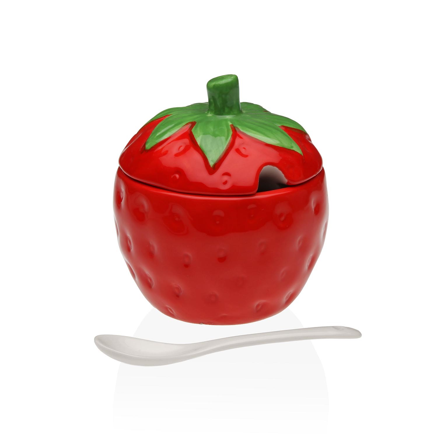 O açucareiro morango é um utensílio de cerâmica que combina funcionalidade e estética, com um design lúdico que evoca a frescura do verão.