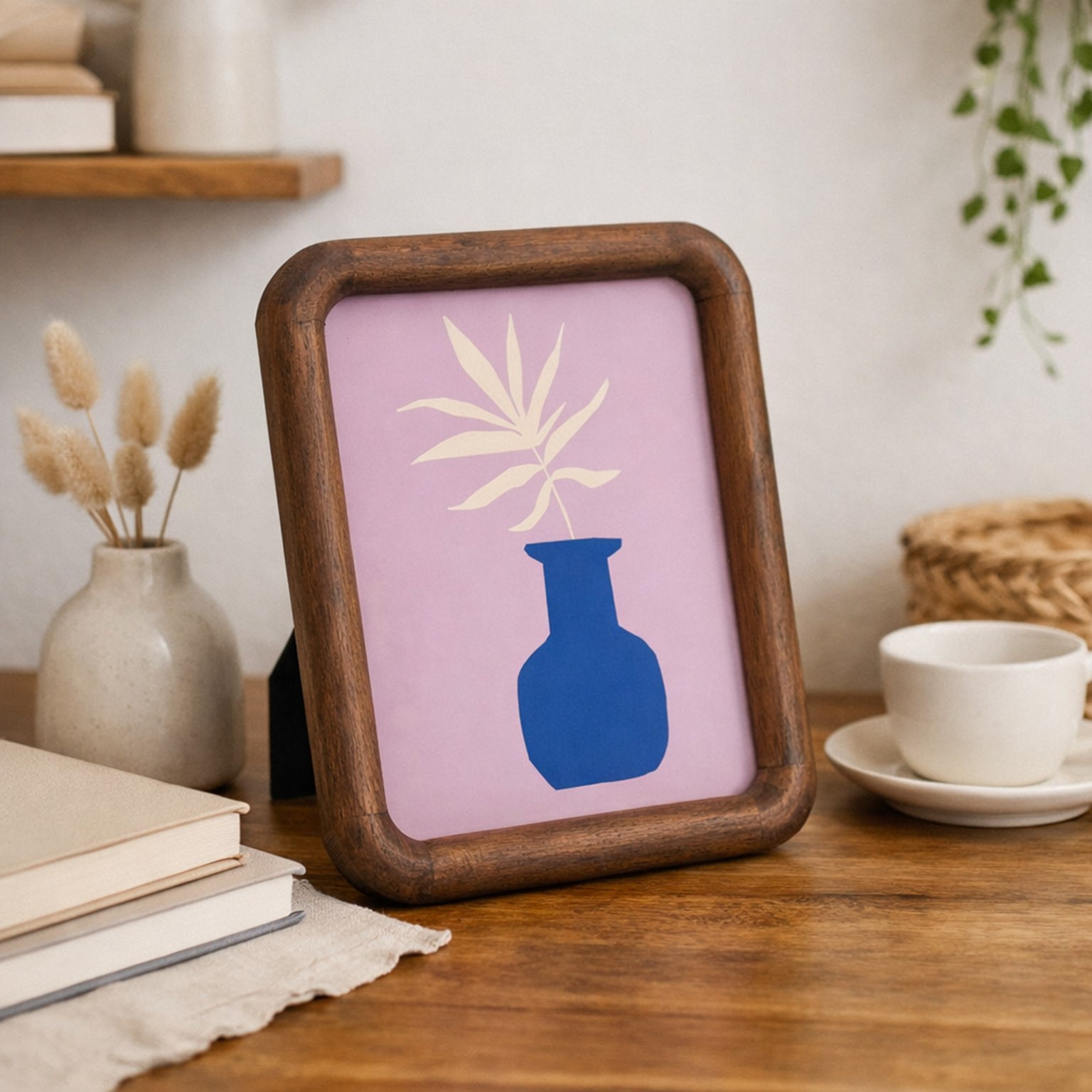 Com uma estrutura em madeira de manga, apresenta um design moderno e minimalista, destacando-se pelos tons naturais e um fundo em cor rosa.