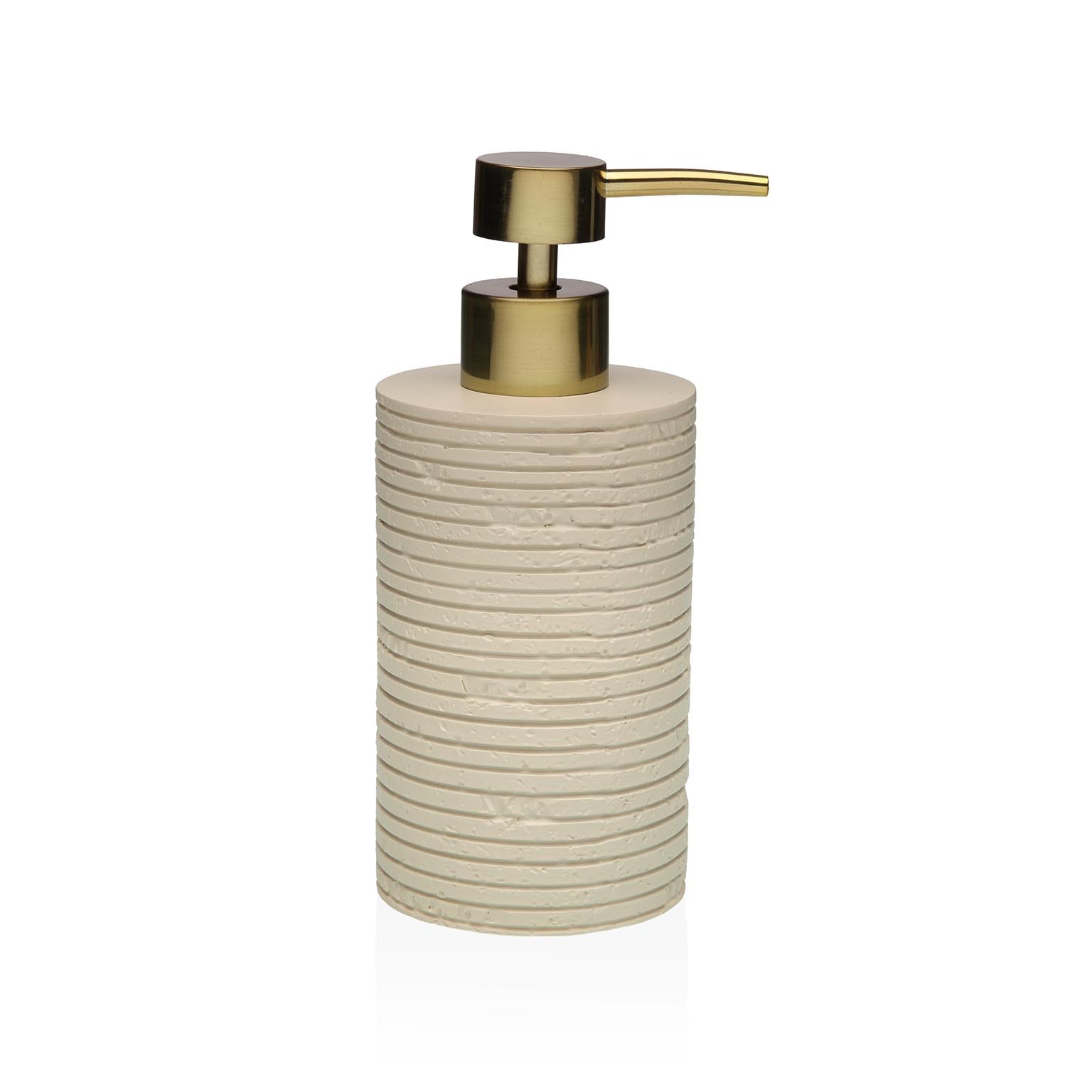 Fabricado em resina, este doseador apresenta uma tonalidade bege suave, realçada por acabamentos em dourado, que conferem um toque sofisticado.
