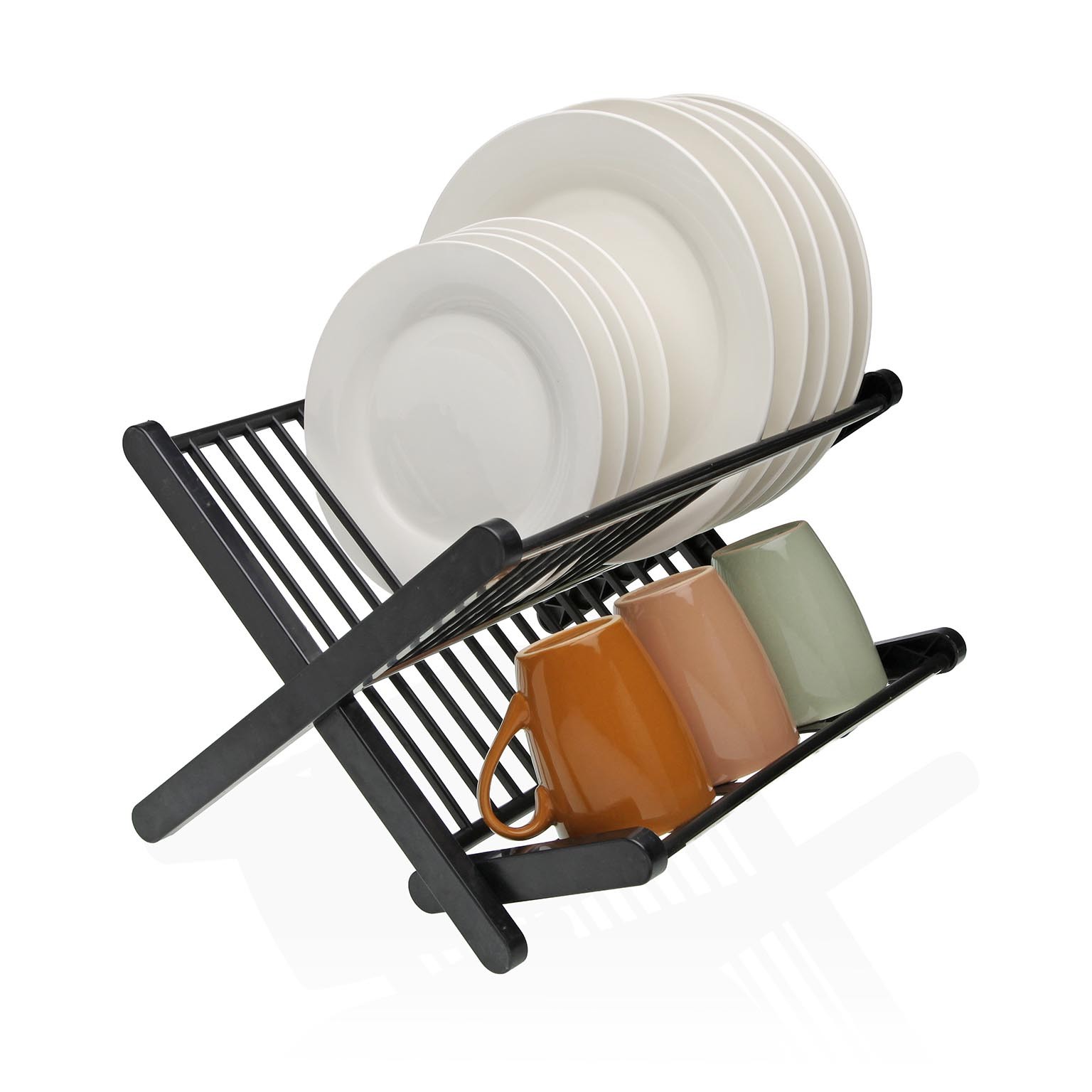 O escorredor de pratos dobrável preto é uma solução funcional e elegante para a cozinha, fabricado em aço inoxidável e polipropileno.