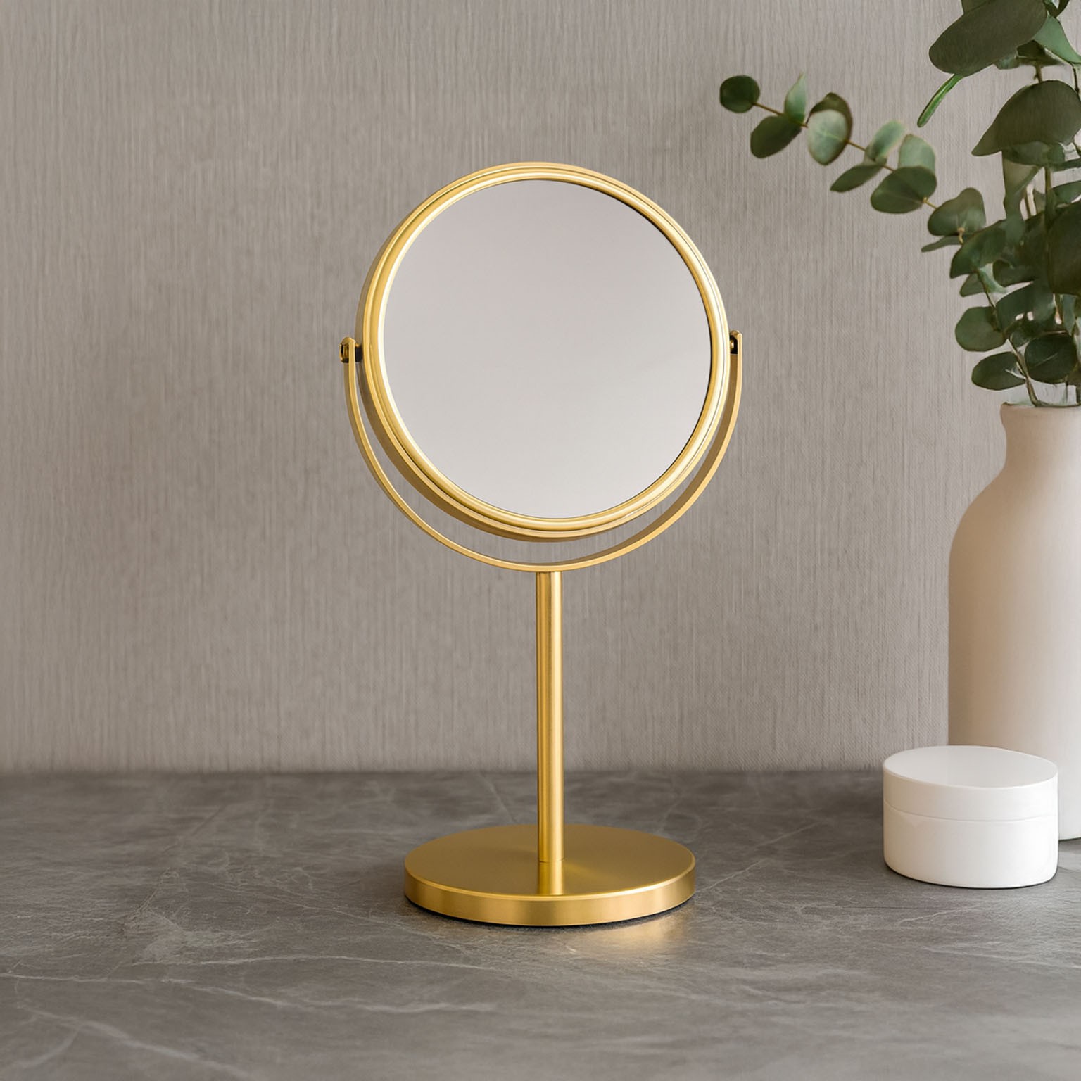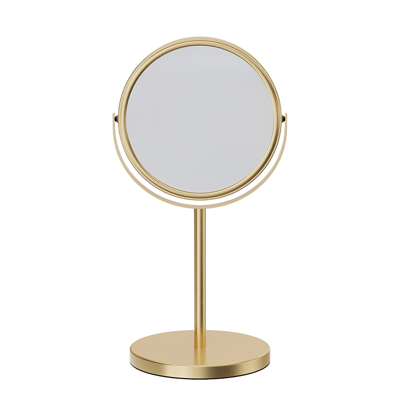Espelho de mesa com base em metal dourado, apresenta dupla ampliação de 1x e 7x, ideal para cuidados pessoais e maquiagem.