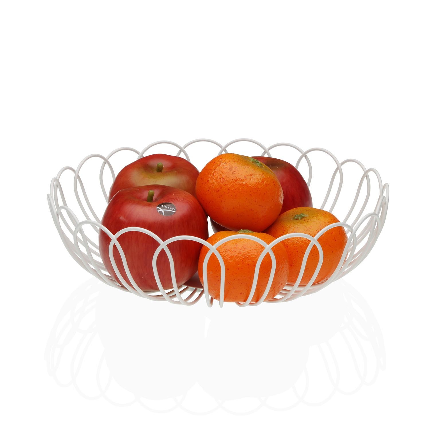 Fruteira decorativa em metal com um elegante acabamento em pintura branca, ideal para armazenamento e apresentação de frutas.
