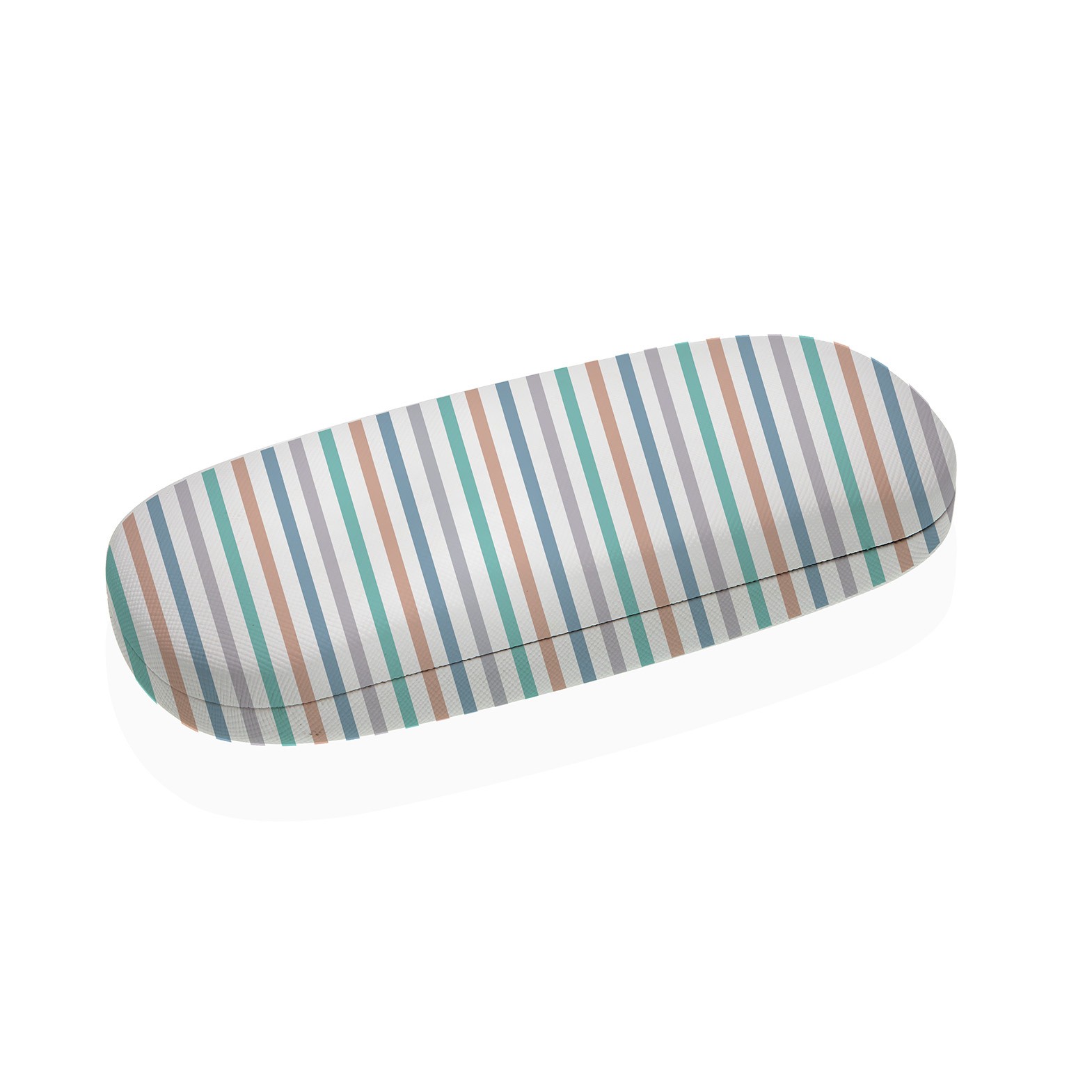 Este estojo de óculos em riscas combina funcionalidade e estilo moderno, apresentando um exterior em tela de poliéster e um interior em PVC e metal.