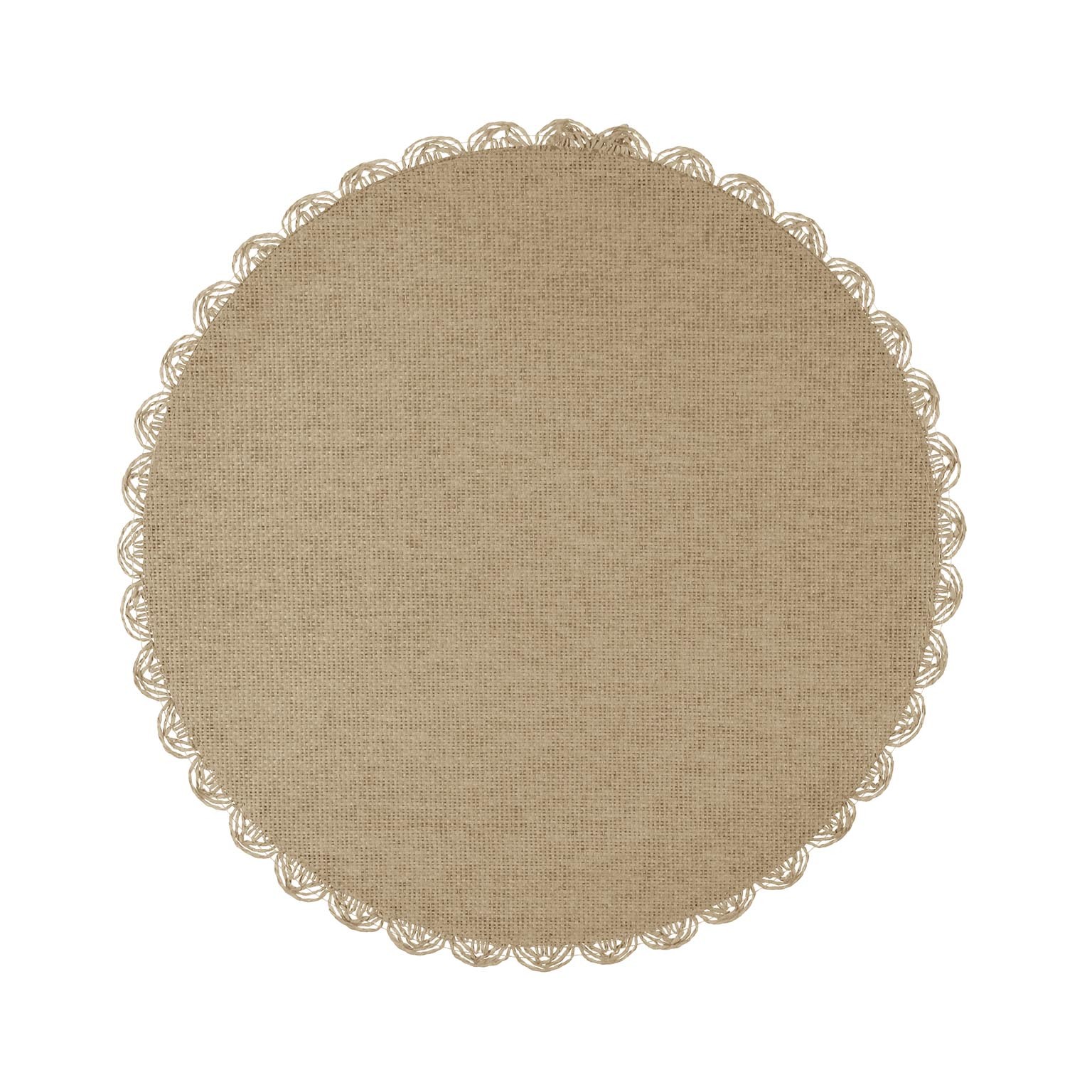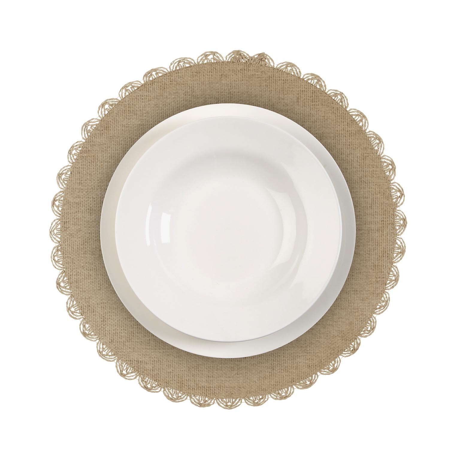 O individual papel redondo natural é uma escolha elegante e funcional para a mesa, medindo 38 cm de diâmetro e 1 cm de altura.