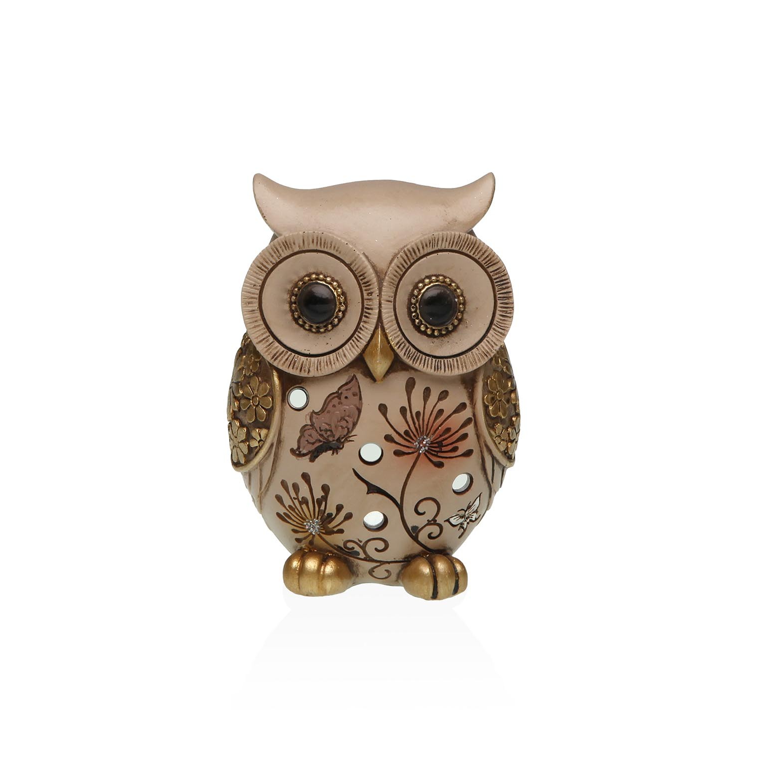 A figura coruja ocre é um objeto decorativo encantador, confeccionado em resina, que traz um toque rústico e vintage aos espaços do lar.