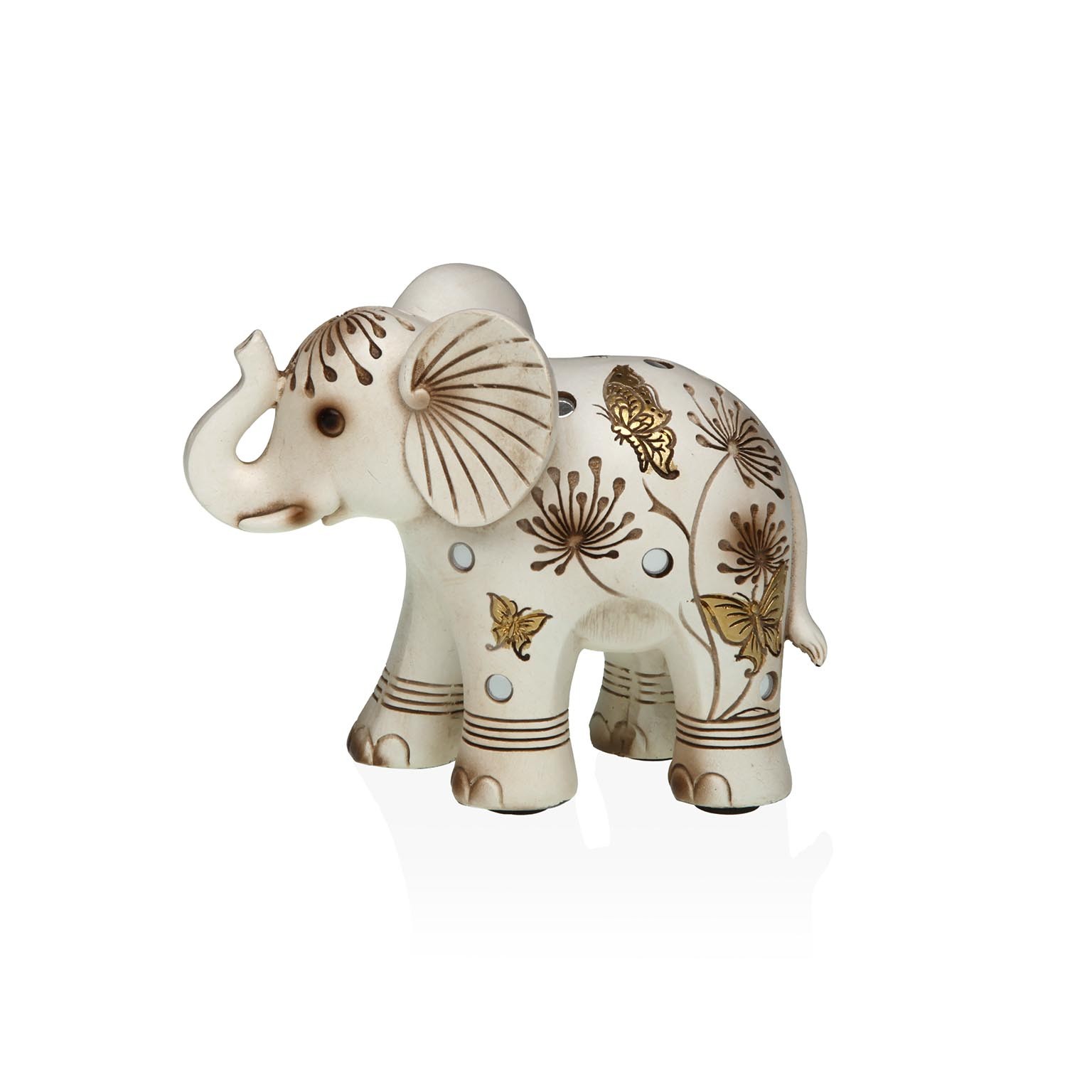 Com dimensões de 11,5 cm de altura, 7 cm de largura e 14,5 cm de comprimento, esta peça em resina apresenta um acabamento em branco com detalhes dourados, perfeita para integrar em salas de estar, halls de entrada ou quartos.