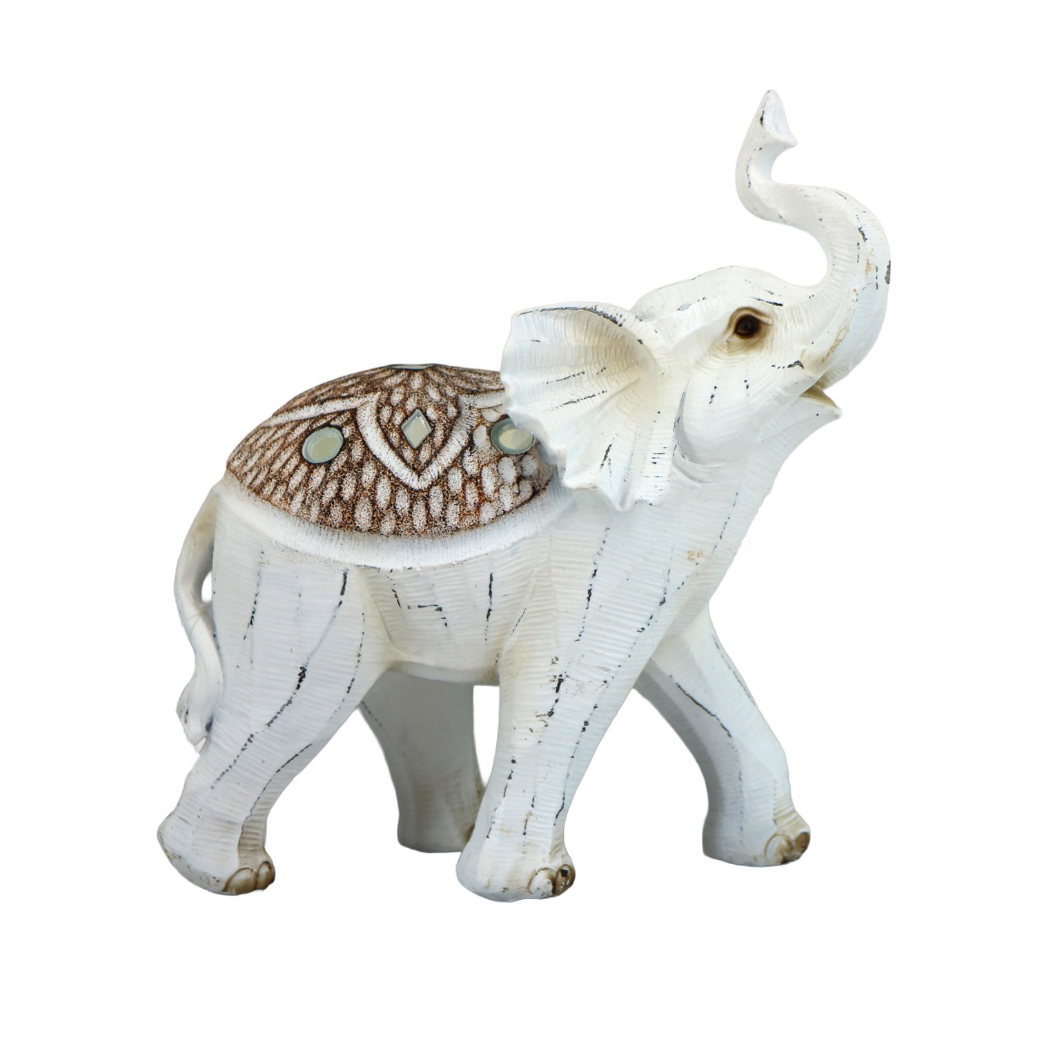 Com dimensões de 16,5 cm de altura, 7 cm de largura e 15 cm de comprimento, esta figura em resina apresenta uma palete de cores em branco, com detalhes em tons de marrom ou dourado.