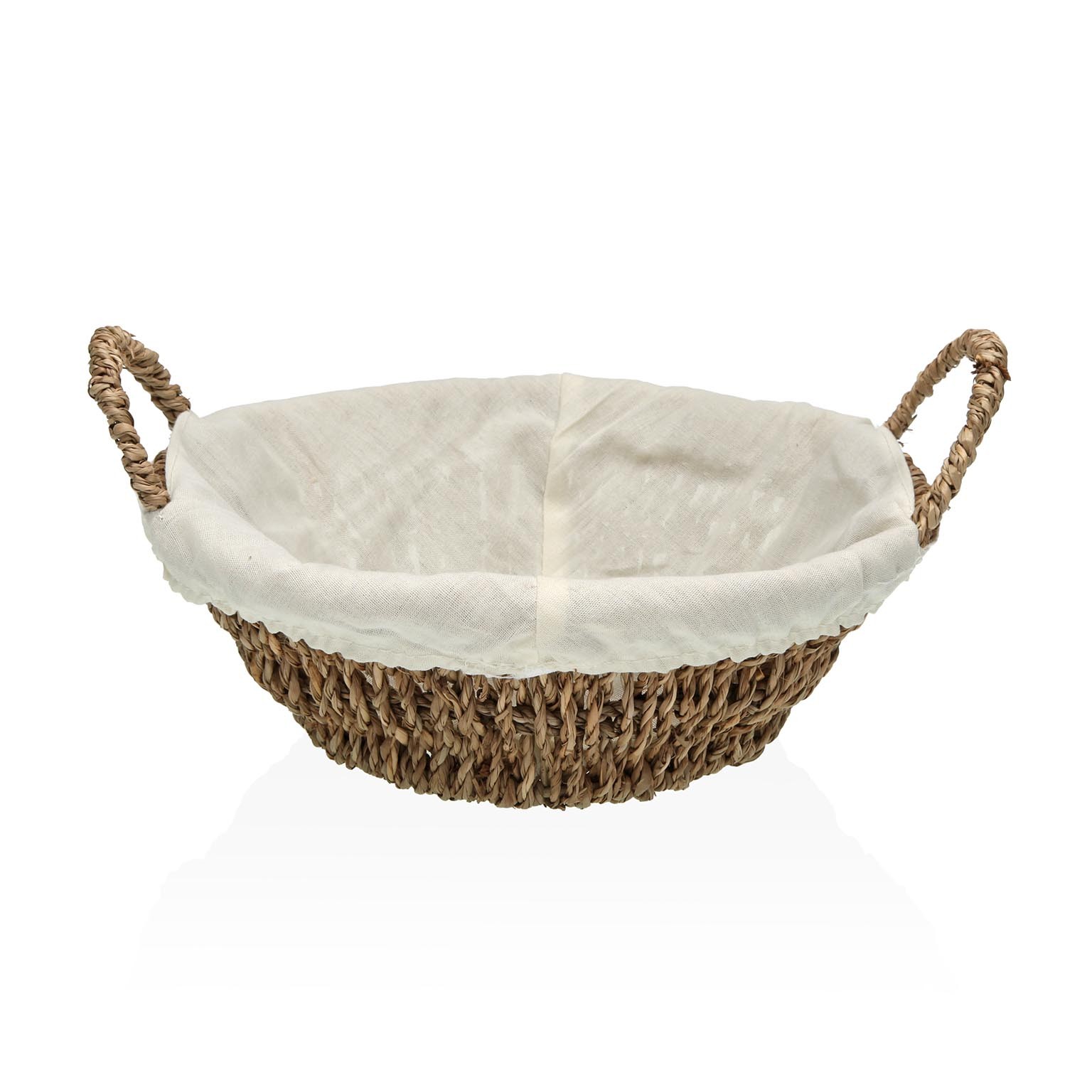 Cesto redondo em alga, com dimensões de 25 cm de largura e comprimento, e 8 cm de altura, ideal para arrumação na casa de banho.